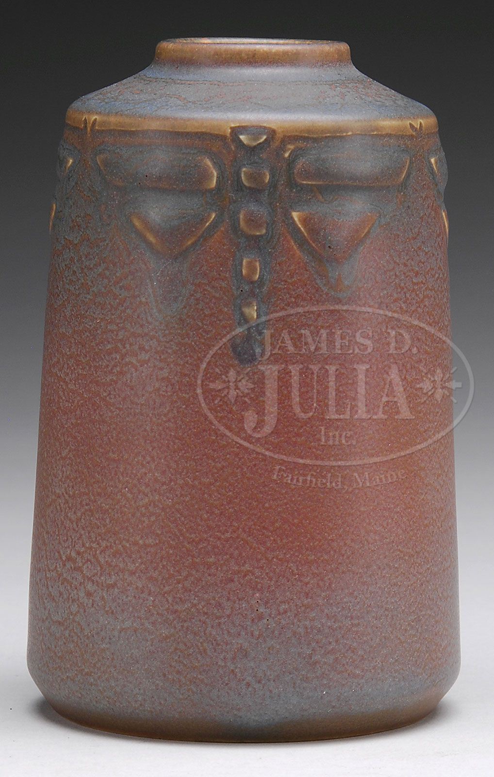 ROOKWOOD ART POTTERY VASE. Marked on base 1870, initialed “C.S.T.” for Charles S. Todd, the date mark of 1912. The matte glazed vase in rose to blueish/green decorated with three raised dragonfly’s at shoulder. SIZE: 6″ h. CONDITION: Very good. 9-27427 (800-1,200)