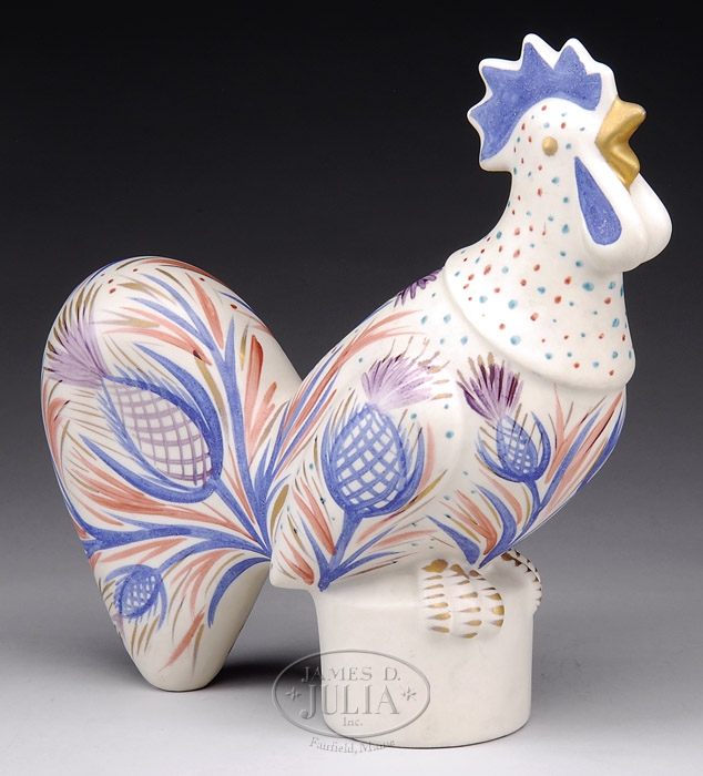 ART POTTERY FIGURE OF A ROOSTER BY WAYLANDE GREGORY. Ceramic figure of a perched rooster crowing having colorful hand painted design in blue, red, gold and purple. Signed on base “Waylande Gregory USA”. SIZE: 13-1/2″ h x 13″ at widest. CONDITION: Very good. 9-92790 (900-1,200)