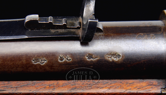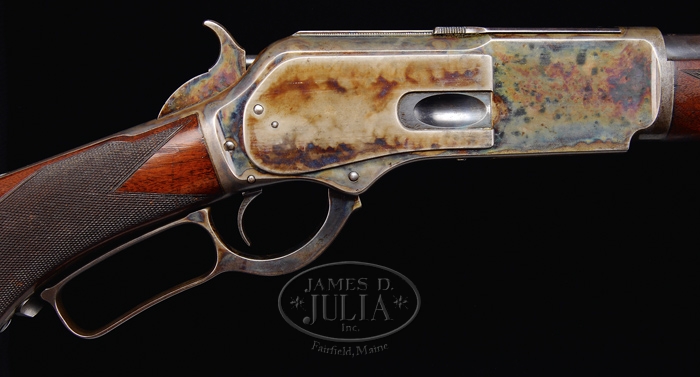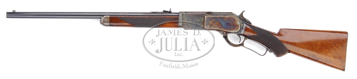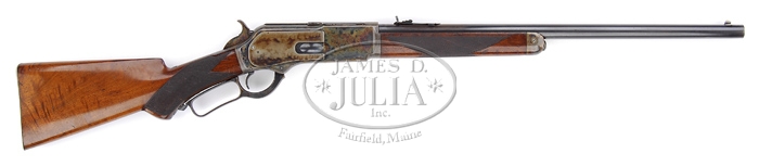 OUTSTANDING WINCHESTER 1876 DELUXE LEVER ACTION RIFLE. SN 39636. Cal. 50-95. Special Order 22″ rnd bbl with half mag, half nickel front sight with short checkered side V-notch sporting rear sight. Mounted with “X” checkered American walnut pistol grip with smooth steel shotgun-style buttplate. Dustcover is marked with “WINCHESTER EXPRESS 50 CAL. 95GRS.”. Inside lower left tang is marked with assembly numbers “1807”, “X”, “S”. The 1807 number is also found on top tang channel of the wood and inside toe of buttplate. Gun has a series of British proof marks on both bbl and receiver. CONDITION: Very fine. Bbl retains 80-85% original bbl blue, thinning to a brown patina from chamber forward approx. 8″. Receiver retains 90-95% of its vivid case coloring. Right side top and left side plate still retain a large amount of original lacquer. Left body of receiver and underneath to balance point are fading colors turning to a silver-gray patina, the bottom at the carry point having the most silver color. Lever and hammer retain nearly all of their bright, original case coloring with only the slightest amount of silvering occurring on the wear points. Buttplate is smooth with a silver-blue patina color. Buttstock is sound with only a few minor nicks and dings and retains 90-95% of its original finish. Forend with its usual nicks and dings has finish wear in the carry area and some finish flaking along top edge of each side of bbl. Mechanics are crisp. Bore is bright and shiny. 4-31590 BT85 (32,500-50,000)