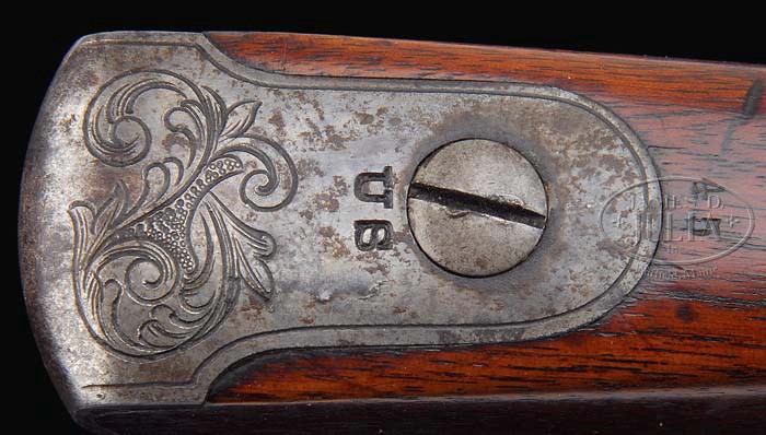 SPRINGFIELD MODEL 1875 OFFICERS MODEL PARTS RIFLE. SN 240560. Cal. 45-70. Beautiful orig, late, Springfield Officer’s Model stock with “SWP / 1881” cartouche on left side and a crisp “P” below checkering on the wrist. It has an orig 1875 buttplate with “US” on the tang and light pattern of orig engraving. It also has batch number “45” just forward of buttplate tang. Forestock & wrist have original checkering with an attached original checkered grip. Top of wrist is mounted with an orig oval base Springfield tang sight. Forestock has a decorative silver plated pewter tip with light engraving. Trigger guard, trigger, bbl, receiver, bbl band & hammer are 1873 rifle parts that were not originally for an officer’s model. Bbl has an orig Beech’s combination front sight and an 1873 ski jump rifle rear sight graduated “1 to 5” on left side with an “R” at front left edge. Breech block is from a correct Officer’s Model with light foliate arabesque patterns marked near the hinge “U.S. / MODEL / 1873”. The thumb latch is engraved to match. Lockplate appears to be from an orig Officer’s Model with an eagle in front of the hammer and marked “U.S. / SPRINGFIELD / 1873” in the center with nice coverage of shaded foliate arabesque patterns. Hammer is not engraved, however hammer screw is lightly engraved. This appears to be a work in progress by someone who found some authentic Officer’s Model parts and was attempting to make a rifle. CONDITION: Fine. Bbl retains 80% thin orig blue. Breech block, lockplate & hammer are silvered case colors, as is the buttplate. Pewter inlay in the forestock retains most of its orig silver plate. Stock is sound with minor nicks & scratches and retains most of its orig hand rubbed oil finish. Mechanics are crisp, bright shiny bore. 4-36323 JR317 (4,000-7,000)