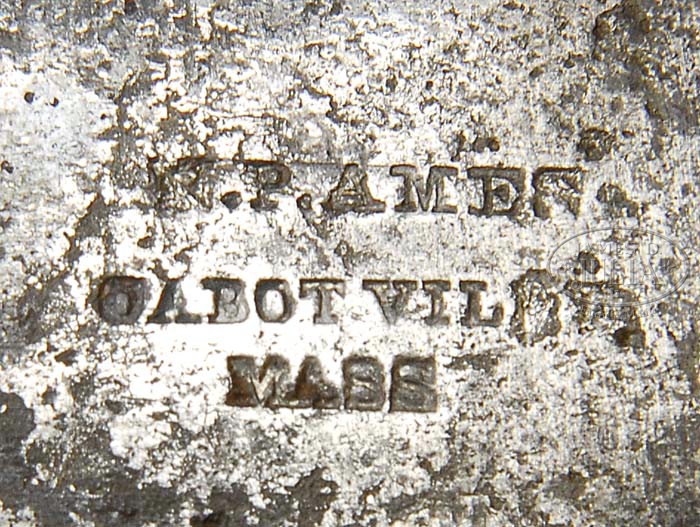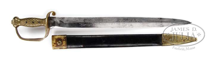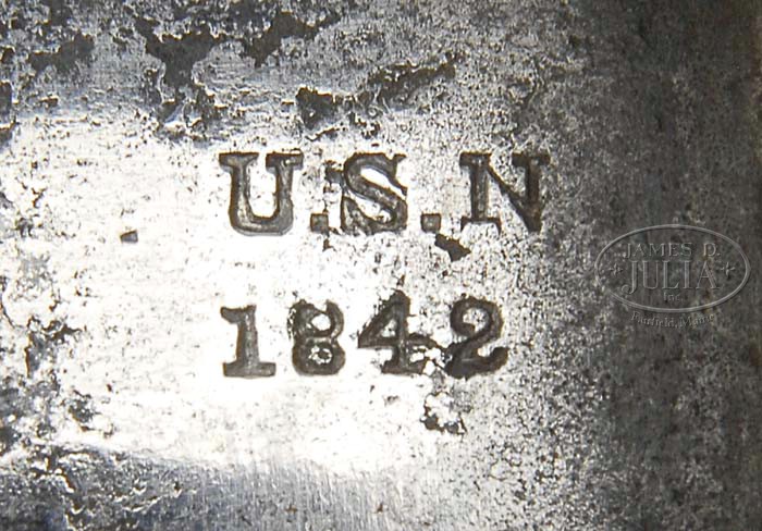 USN MODEL 1841 NAVAL CUTLASS WITH SCABBARD. This is a nice example of the 1st year of production of the regulation Naval cutlass adopted in 1841 but not produced until 1842. This sword is nicely marked “USN/1842” on blade ricasso and opposite side of blade is marked “NP AMES/CABOTVILLE MASS”. The contract for manufacture of these swords was not signed until 1842 so this is indeed an early example. 1842 was Ames last year in Cabotville before moving operations to Springfield. The 21″ double edged blade fits perfectly in black leather scabbard with brass mounts. The drag of scabbard has a small inspector initial “r” stamped on finial. This scabbard is the type made during the Civil War or before for replacement of the originally produced brass riveted scabbards. This is a scarce sword to find in fine condition with original scabbard with good markings. SIZE: 21″ blade. PROVENANCE: Charles Radcliffe Collection. CONDITION: Blade is mostly bright with areas of sharpening, staining and pitting. Brass hilt is stained as are scabbard mounts. Quillon is bent in such that it binds slightly with scabbard throat. Leather scabbard body retains most of its original finish with numerous small cracks and scuffs. The drag is missing three of its four retaining pins. Scabbard mounts are cleaned and have several small dents and numerous scratches. 4-39663 JS19 (2,000-3,000)