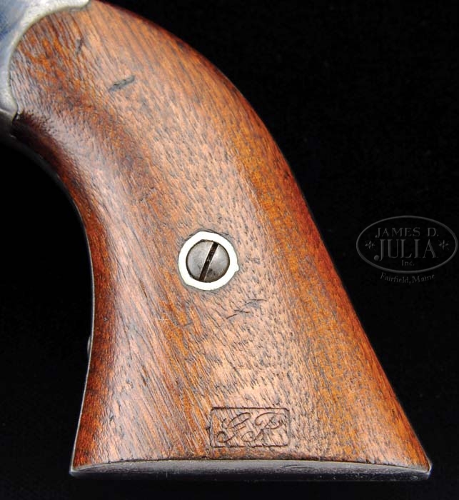 FINE MARTIALLY MARKED REMINGTON NEW MODEL ARMY PERCUSSION REVOLVER. SN 90421. Cal. 44. Blue finish with 8″ oct bbl, pinched post front sight with brass trigger guard and 2-pc walnut grips that have a crisp cartouche on left side, with matching penciled SN on the inside. Various parts have small inspector initials including the bbl, frame in two places, cylinder & trigger guard. Hammer is color case hardened. Although these revolvers were produced in fairly large quantities during the Civil War they were virtually all issued to combat units with distribution throughout the Union Army. They are rarely found with much orig finish. CONDITION: Very fine, all matching including cyl & grips. Overall retains 95-96% glossy orig factory blue with about all the losses from flaking on the bbl with only slight sharp edge wear elsewhere on entire revolver and some slight thinning and flaking on cylinder. Trigger guard is a lemon yellow patina and hammer retains about all of its orig case colors. Grips are crisp with a couple of minor chips and handling marks and retain most of their orig factory finish. Mechanics are crisp, brilliant shiny bore. 4-38631 JR206 (4,500-6,500)