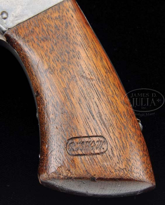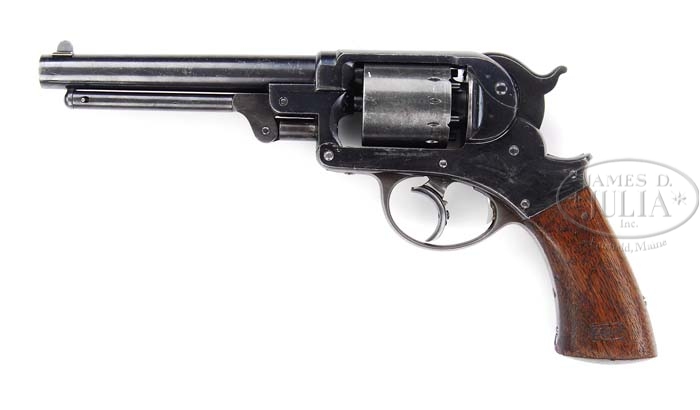 FINE MARTIALLY MARKED STARR DA ARMY REVOLVER. SN 5518. Cal. 44. Blue finish with 6″ rnd bbl, dovetailed front sight with rear sight in hammer nose. It has usual frame markings on each side and is mounted with 1-pc walnut grip that has a crisp cartouche on each side. Various parts are stamped with a small “W” inspector initial. Only about 23,000 of these scarce revolvers were produced in the late 1850’s through the early 1860’s and most saw service throughout the Civil War and later in frontier Army units during the Indian Wars, therefore few are found today retaining much orig finish. By comparison, this revolver is extremely rare when one considers that the Colt 1860 Army revolver was produced in about the same period with over 200,000 made. CONDITION: Very fine. Bbl & top strap retain about 95% strong orig blue with flaking over top of bbl and some minor flaking at rear end of top strap. Frame retains 92-93% strong orig blue with some flaking on left side. Cyl retains about 95% thin orig blue. Trigger guard, front & back straps are a blue/gray patina. Grip has chipped front edges with light handling & use marks and retains most of its orig oil finish and two crisp cartouches. Mechanics are crisp, brilliant shiny bore, possibly unfired. 4-38632 (4,500-6,500)