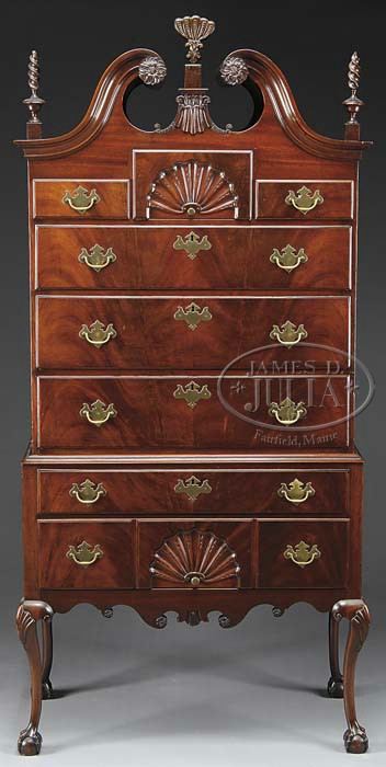 NEW ENGLAND CHIPPENDALE STYLE BENCHMADE HIGHBOY. 20th Century. Constructed of old parts. The upper case with full bonnet swan’s neck pedimont terminating in floral rosettes flared by flame finials, centering a plume finial. Two short drawers centering a fan carved deep drawer over three drawers fitted to the lower case of a long drawer over three aligned short drawers, the center most fan carved above a shaped apron carved with floral rosettes. Raised on cabriole legs, fan carved with scrolled returns on claw and ball feet. SIZE: 81″ h. Case 36″ w. Overall 39-1/2″ w x 21″ d. CONDITION: Very good. 9-24686 (700-900)