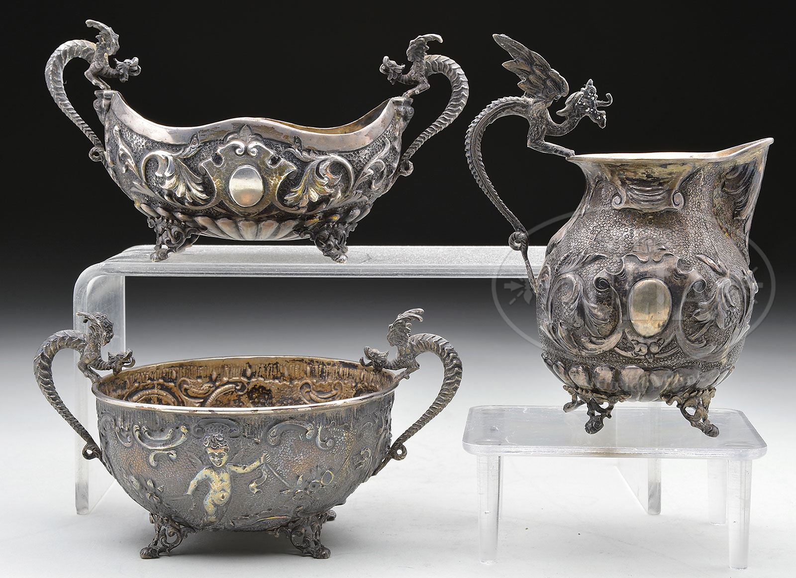 THREE PIECES OF .800 CONTINENTAL SILVER TABLEWARE. The lot includes a matching sugar and creamer having griffin handles and raised scrolling leaves with flower heads. Marked on base .800 with a fleur-de-lis. Along with a similar handled sugar bowl with griffin handles decorated with raised cupids and roses, similarly marked. SIZE: Creamer: 5-3/4″ h. Bowls: 3-1/2″ h. WEIGHT: 17 tr. oz. CONDITION: Generally very good. 9-29823 (200-400)