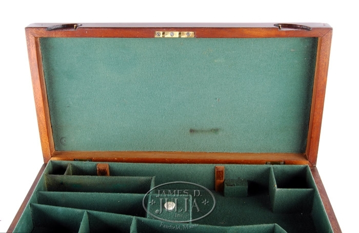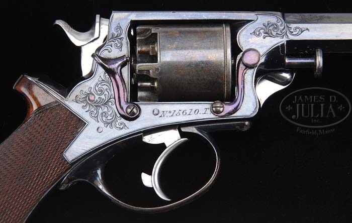 SCARCE CASED ENGRAVED TRANTER’S PATENT DA ARMY-SIZED REVOLVER. SN 15610T. Cal. 45. Blue and color case hardened with 6″ ovoid-shaped oct bbl with small dovetailed pin front sight and fixed rear sight at the rear of the top strap. Rammer is mounted to left side of frame. Revolver is dbl action with a checkered hammer spur and has color case hardened buttcap and 5-shot cyl. It is mounted with a nicely figured, checkered 1-pc walnut grip. Left front side of the frame and rammer handle are stamped “TRANTER’S PATENT” and the top strap is engraved “THOS.WILLIAMS.SOUTH.CASTLE.ST.LIVERPOOL”. Right rear side of frame behind the cyl has an articulated safety with a small pin on its nose which corresponds to the small holes in the rear face of the cyls in the lands between the nipple recesses. Revolver is very nicely engraved with tasteful and well-executed foliate arabesque patterns and engraved rammer screw head. Accompanied by its orig English-style mahogany casing with empty brass medallion centered in the lid. Interior is green felt lined and compartmented in the bottom for the revolver, a Dickson bag-shaped flask, its orig Tranter’s Patent marked brass 2-cavity bullet mold with blued steel sprue cutter marked “54”. Also accompanied by an ebony-handled turn screw and ebony-handled nipple wrench. Left front corner compartment contains a lacquered tin of Tranter’s Patent Lubricating bullets with green and black label. The adjoining compartment contains a lacquered tin of Tranter’s Patent lubricating composition and the right rear corner contains an early lacquered tin of Eley Bros caps. Front compartment contains a brass & ebony cleaning rod/bullet starter with concealed worm. Center covered compartment, with bone pull, is empty and left rear compartment contains a modern pewter oil bottle. A fine, complete set. CONDITION: Revolver appears to be new and unfired retaining virtually all of its orig glossy factory blue with bright, orig metal finish on the rammer and rammer handle, hammer and trigger. Cyl and buttcap retain strong case colors. Grip is crisp showing very little or no wear. Mechanics are crisp, brilliant shiny bore. Case has a crack across the lid with another in the bottom along with a cpl of grain checks, otherwise is solid and retains most of an old restored finish. Interior is lightly to moderately faded with very light soil. Implements and accessories are all crisp and new. 4-38619 JR298 (7,000-10,000)