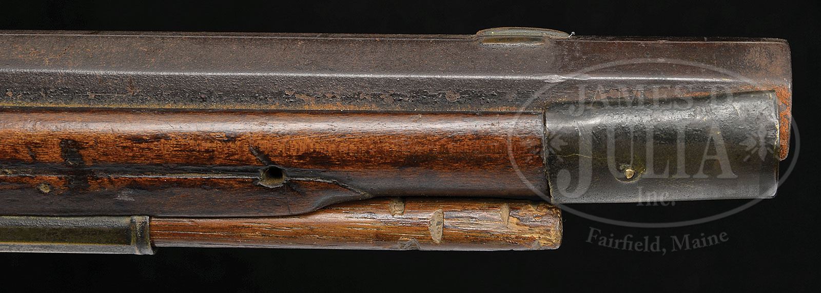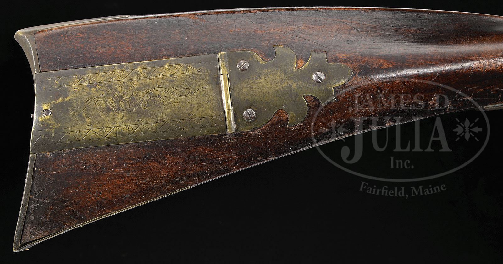 UNSIGNED STOFFEL LONG ALLEMAENGEL SCHOOL FLINTLOCK RIFLE. SN NSN. Cal. .50 smoothbore. Rifle has a 46-1/2″ full oct unsigned bbl. Stoffel Long worked and is buried in Stony Run, Albany Township, PA. He was born in August of 1791 and died in October of 1858. Rifle has a typical Allemaengel school 2-piece brass patchbox with Stoffel Long’s engraving. Philadelphia flintlock is marked “Josh Golcher”. All the furniture and the inlay engraving are typical of Long’s work. PROVENANCE: Collection of Woody Frey. CONDITION: Rifle is in nice condition with exception that the nose cap appears to be a replacement. 4-48494 RG11 (4,000-6,000)