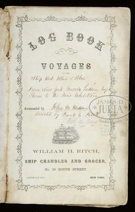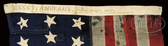 IMPORTANT 13 STAR US CIVIL WAR BOAT FLAG LATER USED AS FLAG ON SMALLEST SAILING SHIP “RED, WHITE & BLUE” TO CROSS THE ATLANTIC IN 1866. This 13 Star Boat Flag measures 32″ on hoist & 42″ on fly. The hoist is inscribed in contemporary brown ink “USS FLAMBEAU’S PICKET BOAT 1864 ACTING ENSIGN JM HUDSON”. The reverse of hoist reads “SHIP RED WHITE & BLUE OF NEW YORK TO LONDON 1866” and “PARIS EXPOSITION 1867”. Captain John M. Hudson was an Ensign on the United States Steamship Flambeau in 1864. He used his small “picket boat flag” on miniature ship Red, White & Blue which he captained from New York on July 9, 1866 and landed in Hastings, England on August 16, 1866. His arrival caused much notoriety for himself and the inventor & builder of this boat, Oliver R. Ingersoll. Ingersoll was trying to market this small 26′, two-ton, three-masted miniature ship for potential use as a life boat. The crowds and the acclaim of the arrival of The Red, White & Blue in England must have met with similar fervor of the arrival of Charles Lindbergh in Paris on his historic transatlantic air flight. The sailing of a 26′ boat from NY to England was just as exotic an adventure in 1866. When the ship arrived many skeptics questioned whether the ship had actually come from America since this had never been done in such a small vessel and the vessel would have had to average 96 miles a day. Several newspapers published letters of noted scholars & sailors stating this could not have been done. Several of these orig letters are contained in this archive with letters of other scholars studying the orig, detailed log of the cruise stating no doubt this trip did occur because coordinates cited on a daily basis could not have been fabricated and several other vessels sighted The Red, White & Blue in the middle of the Atlantic Ocean and cited coordinates & dates identical to that of their ship’s log. After all this, the sailors were vindicated and the journey stands as one of the most impressive sailing feats of the 19th C. To those who have never made an extended voyage in a small craft in the open ocean, they might visualize this crossing as easy, possibly pleasant. But the log of the little ship tells the real story. The water taken aboard during storms & heavy seas caused the clothing & bedding to remain wet & moldy for the duration of the trip. Much of the stores & food spoiled and had to be discarded. The Captain’s watch which was critical to determine the longitude of the vessel rusted after 4 days and they had to navigate by sights at sunrise, sunset and the noon meridian. Significant events noted in the accompanying orig log: on July 18th about 11:30pm “Struck something hard on port bow and stopped the headway.” (The metal hull withstood the blow without any leaks, a wooden boat would probably have sank.) July 24th “Fearful foam rising 5 to 6 feet.” July 30th “A large whale passed by at 3am.” Aug 4th “Saw a barque, the first in 20 days.” Aug 6th “Strong gales & heavy seas from midnight to morning. A blind sea took ship on the port quarter & hove the vessel on its starboard beam but it righted after a half minute, everything soaked.” Aug 7th “Opened the 6th keg of water.” Aug 12th “Shipped a very heavy sea between main & mizzen rigging and completely knocked the ship on her beam ends. This was the 4th knock-down since leaving New York. From the noon position, found that the ship had overrun the reckoning by 27 miles south. Not bad in a distance of 3,300 miles. Entering the English Channel 34 days after leaving New York.” Aug 19th “Fanny died after being sick for several days.”(Fanny was the ship mascot along with her two-man crew, Captain and mate). After such acclaim, Captain Hudson became quite a celebrity and displayed his ship in the Crystal Palace in London and later at the Paris Exposition of 1867. There was a small pamphlet published that an orig copy is present with this archive that was available at the Crystal Palace Exhibition in 1866. There are two orig 1866 Currier & Ives hand-colored lithographs showing this flag flying from “The Miniature Ship Red, White & Blue”. The orig manuscript ship’s log is over 70 pgs long and measures about 15″ x 10″ and is filled with ink text detailing every detail of travel. There are also 12 newspaper clippings pasted onto a blank page in log from various newspapers showing opinions of the voyage. Also accompanying in this lot is a 100 page bound manuscript “Red, White & Blue Log of a Life on the Ocean Wave”. Included in this narrative is a history of the ship and also mentions of several yacht races including the America’s Cup race. This manuscript apparently was written to be made into a book based on the orig log and documents here. There are numerous testimonial letters & printed documents concerning the history of this flag and ship and Captain John Hudson’s history including his rank insignia and a couple documents referring to John Hudson’s Civil War naval service. This is a wonderful American 13 star Boat Flag with extraordinary history and provenance and archive. PROVENANCE: William Guthman CONDITION: Flag overall is in very good condition as conserved. Flag retains good and discernible orig ink markings on hoist. Bunting has several contemporary repairs to time of use in the canton as can be seen in photos. There are several holes and stained areas but colors are still vibrant & bright. Log book & manuscript book are very good and complete, easily read. There is some chipping to covers but contents good & discernible. The numerous letters, fliers and pamphlets associated with this archive are all in average good condition and in loose-leaf binder and protective sleeves. Captain Hudson’s Civil War era naval rank shoulder boards are very good overall, though missing a couple rows of bullion border, the black wool backgrounds and embroidered fluted anchor insignia are complete