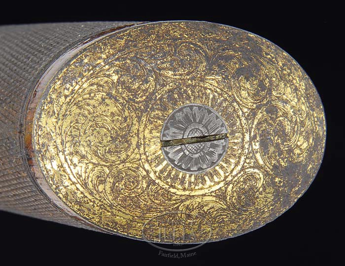 RARE CASED ENGRAVED & GOLD PLATED TRANTER’S PATENT DOUBLE ACTION PERCUSSION REVOLVER M. SN 12445T. Cal. 45. Fabulous English revolver with 6″ oct bbl, dovetailed ball on a stick front sight with fixed sight at rear of top flat. Top flat is marked “B. COGSWELL, 224 STRAND, LONDON” and in small letters “GRISWOLD & Co N.O.”. Griswold was a known merchant in New Orleans that regularly dealt with the CSA during the war. It has rammer attached to left side of frame with latch on left flat of bbl at muzzle. It has the unusual Tranter’s Patent long spur trigger extending through the trigger guard which functions similarly to the Savage Arms Navy revolver. Long bottom spur is pulled which brings the hammer to full cock & rotates the cylinder. Small interior trigger fires the revolver. Fitted with very finely checkered 1-pc walnut grip. Frame, bbl, front & back straps, cylinder, trigger guard & butt cap are beautifully engraved in very fine foliate arabesque scrolls and entire revolver is gold plated. An additional feature is the automatic safety, mounted on the left rear of frame, which is only withdrawn when hammer reaches full cock. Accompanied by its orig walnut, English style, green felt lined distributor’s case with brass disc on top and the Cogswell label inside lid. Bottom is compartmented for the revolver, a medium sized Dixon bag flask and its orig 2-cavity brass bullet mold with blued steel sprue cutter marked “54”. Also included is a Hawksley pewter oil bottle, a checkered ebony handle turn screw & matching nipple wrench, a lacquered tin for Tranter’s Patent bullet lubrication containing a few lead balls, a wooden parts box & a paper covered tin for Joyce caps. A covered compartment in the center contains orig functioning key & five spare nipples. It appears to be an altogether complete set that undoubtedly was intended for a presentation to a high ranking military officer or government official. CONDITION: Extremely fine. Revolver retains 90-93% strong orig gold plating with light flaking & wear on rammer lever. Cylinder appears to be unfired. Grip is sound with a couple of small dings & shows light wear retaining most of its orig varnish. Case lid has a grain check in one end & a crack across rear edge with a couple of others in the bottom and has numerous small nicks & scratches & retains most of its orig varnish. Interior is moderately faded with light wear from revolver. Accessories are very fine. Bullet mold appears to be unused. 4-35540 JR396 (12,500-17,500)