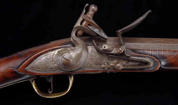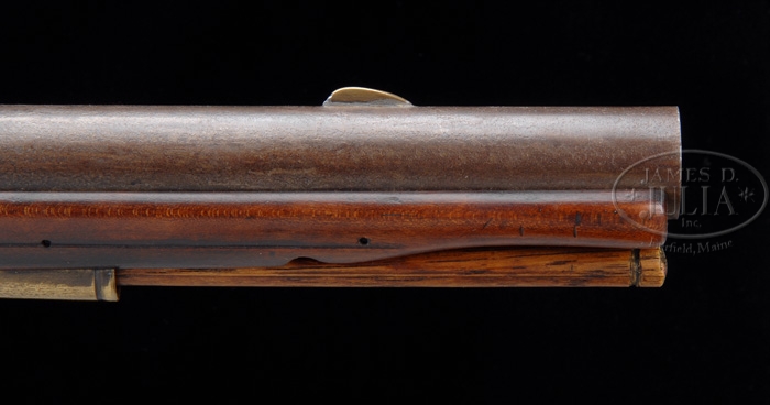 FINE CUSTOM MADE AMERICAN FLINTLOCK FOWLER BY KEN NETTING. SN NSN. This fine reproduction rifle has a 68 Cal. smooth-bore 48″ octagon to round barrel. The fowler is cherry-stocked with a Grice reproduction lock dated 1762 and with a crown over GR. Nicely executed raised fantail carving behind upper tang and teardrop carving behind lockplate and sideplate. Early American-style buttplate and serpentine sideplate. Silver escutcheon thumbpiece on wrist. Ken Netting’s rifles are highly sought after by collectors and shooters alike, and are seldom available on the secondary market. He currently has a two year waiting period for his custom fowlers. This finely crafted fowler represents a circa 1770 New England American fowler utilizing imported British parts. CONDITION: Fine and as new throughout. 4-37643 RGG14 (1,800-2,500)