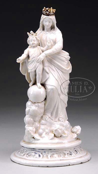 CONTINENTAL PORCELAIN FIGURE OF MADONNA AND CHILD. Late 18th, early 19th century. Both figures modeled with crowns, the child posed on a globe. Both figures standing on a cloud-like plinth from which three putti are emerging. Modeled on a molded socle encircled with vinery. SIZE: 13″ h. CONDITION: The majority of enameled and painted decoration and gilding has been removed and/or worn off. Many tips of the crowns are missing. Damage to child’s proper left hand. No maker’s marks visible. 9-97870 (300-500)