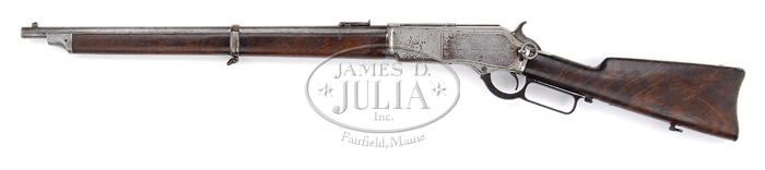 RARE WINCHESTER MODEL 1876 CARBINE LEVER ACTION RIFLE SN 32623. Cal. 45-75. Usual 22″ round bbl, square base Barley corn front sight, with 1876 marked thousand yard ladder rear sight. Left side of receiver mounted with stud and ring. Mounted with fancy, uncheckered, American walnut, straight grip with carbine buttplate. Gun has unmatched swing swivels with front being 3/4″ variety and rear 1″. Accompanied with Cody Winchester letter identifying this gun as carbine, half nickel, and received in warehouse on Jan 20, 1883, and shipped from warehouse on Jan 24, 1883. Special finish 76 carbines are quite rare. CONDITION: Good to very good. Bbl and forend cap finish or lack thereof is of a silvery mix with brown patina color entirely. Center bbl band is mostly a medium brown patina. Receiver has 40-50% of its orig nickel with right side plate being entirely flaked to a silver/gray patina. Left side plate has traces of orig nickel with spotty silver and brown patina. Balance point and bottom of receiver show traces of nickel as does the carrier, with the major amount being worn to a brown patina. The forward portion, the top and tang areas of receiver retain considerable amount of its orig nickel. The dust cover is worn and flaked to carry only traces of nickel with balance being a light brown patina. The well figured stock is sound with about 1/2″ chip on left side of upper tang and receiver. There is also a grain crack on left side at about center of buttplate forward about an inch. There are traces remaining of an old shiny added finish. The wood has characteristic light nicks and dings of a gun of this vintage. Forend is sound with traces of an added shiny finish and also carries numerous small nicks and dings. Mechanics are crisp, bore shows moderate shallow pitting. 4-32658 BT62 (5,000-8,000)