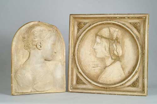 UNSIGNED (20th Century) TWO PLASTER RELIEF PLAQUES. 1) Square partial gilt plaster plaque of art nouveau woman’s bust. Round image is self framed which is decorated with flowers. SIZE: 18” x 18”. CONDITION: Some light chipping. 2) Relief dome top plaque of young girl. Back marked with metal tag inset into plaster “P. P. Caproni & Bro. Boston, Caproni Casts”. SIZE: 16” x 12”. CONDITION: Repaired horizontal break across center. Chip at one end, otherwise good. 9-98380 (50-100)