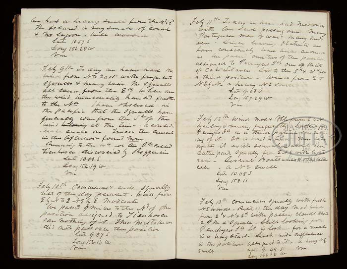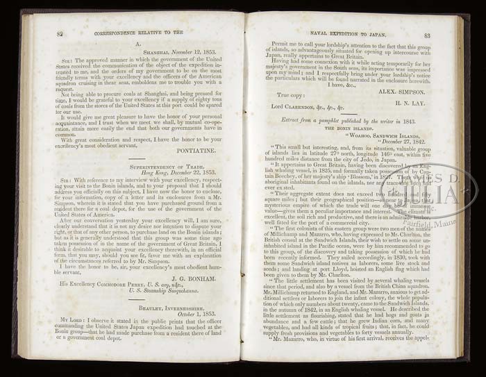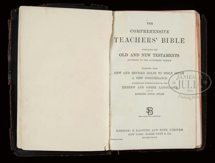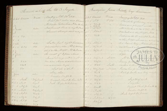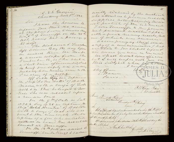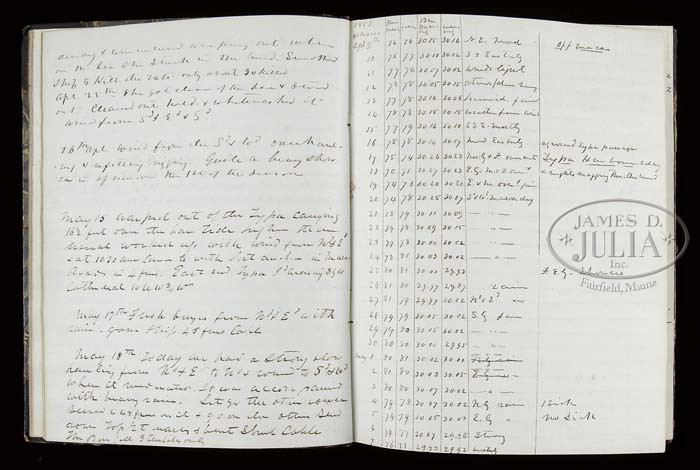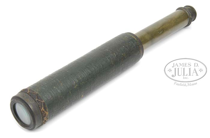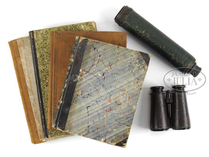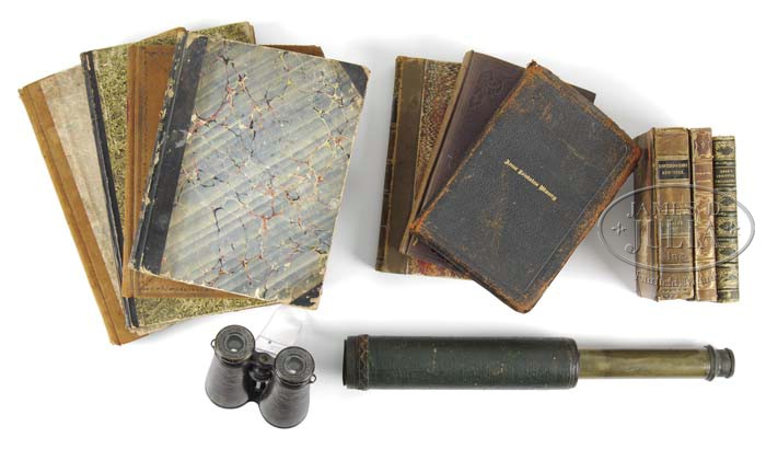 ARCHIVE OF WILLIAM LEWIS MAURY, UNITED STATES AND CONFEDERATE STATES NAVY. This archive consists of telescope, pair of field glasses, and four manuscript journals, one being on the sloop Saratoga, starting July 20, 1851 and ending April 26, 1853 and covers ship’s cruise from Norfolk, Virginia to Macao, Hong Kong and Japan. This was part of Perry’s Japan expedition. The second bound log details events from September 18, 1830 aboard the USS Brandywine through May 18,1832. A third journal of Lt. Maury details events while on the brig Porpoise from June 12 until June 26 three years later. There are no year dates marked in this book but it must be the US Explorative cruise of 1838-1842. This book starts out in Somo Somo near Goat Island in Polynesia. This journal contains much detail as to positions and sailing day by day and of the people they make contact with on the islands. On July 26, the first year of this diary, Maury details landing on an island and his men being attacked and killing 25 or 30. On the 27th they are trying to negotiate peace with the Chief. Many details concerning this Polynesian rebellion for several months. This is an interesting diary/journal that would be great transcribe and to unravel the events. The fourth journal only contains about 50 pages but includes retained letters sent while William Maury was commanding the Virginia Navy yard as a Lieutenant in the Confederate States Navy. The first report is June 15, 1861 where Maury is reporting “three rifled shells from the Rik Rass this morning fell near our encampment and exploded about 50 yards from the battery.” Subsequent reports refer to artillery positions around Norfolk and troops. Maury on July 31, 1861 reports “the enemy at Old Point have been looking into our camp this morning from a balloon.” This journal continues through 1862 to May 1863 when Maury was now a Lieutenant commanding the CSS Georgia. Detailed letters written to his superiors James Bulloch, Secretary of Navy Mallory and to Representative John Slidell, the Commissioner of the Confederate States in Paris. All these entries have interesting content. One letter from Cherbourg, France November 1, 1863 mentions that the CSS Alabama and the CSS Tuscalusa made a narrow escape leaving the harbor. The last entry in journal is May 15, 1864 on the CSS North Carolina stating he is hoping to make it to Willmington tomorrow. There is an early pair of field glasses made by Lemaire Paris, that measure 5″ long closed and 6-3/4″ fully opened. Optics are fairly good, one lens is cloudy. These are an early pair of “twin telescopes” with a straight bridge. Body has a thin leather cover and brass covered lens enclosures are black japaned. There is a telescope that closed measures just over 11″ closed and about 25″ fully opened. No discernible maker’s markings but first tube is marked “Day or Night”. The body of telescope is decorated at sea with a green painted sewn canvas held in place by knotted twine, typical sailor decoration from the mid-19th century. CONDITION: Journals are all sound, pages good, easily read. There are three additional books from William Maury’s library, and so signed, one being an 1835 edition of the History of New York by Knickerbocker. Both boards are loose on this edition. There is also an 1851 poetry book and a government printed edition of Admiral Perry’s Japan Expedition. There are also three additional books that belonged to other Maury family members, including a Bible that has gilt embossed name on cover “Anne Fontaine Maury”. Field glasses and telescope has rich patina to brass and appear in “as found” attic condition overall. 4-44196 JS102 (3,000-5,000)