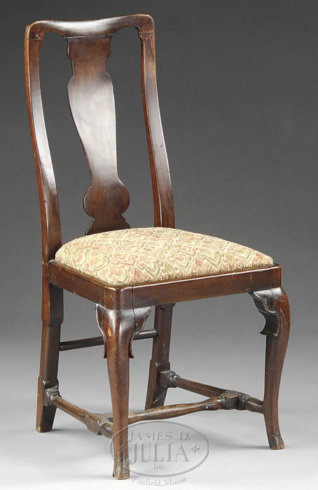 NEW ENGLAND QUEEN ANNE WALNUT SIDE CHAIR. 2nd half 18th century. The yoked crest rail continuing to shaped stiles centering a chamfered vasiform splat, the trapezoidal slip seat fitted within a conforming rail, raised on frontal cabriole legs with molded shaped returns, the rear legs backswept and blocked joined by an H-form stretcher. SIZE: 39-3/4″ h. of chair x 17-1/2″ h. of seat. PROVENANCE: From a home in Charlotte, Vermont. CONDITION: Retaining original pegged and pinned construction, old restoration to proper left crest rail at stile, seat rail stabilized with early forged nails, rear glue blocks in seat frame are replacements. Retains old surfaces. Slip seat early but not examined for originality. Overall good. 9-99048 (600-900)