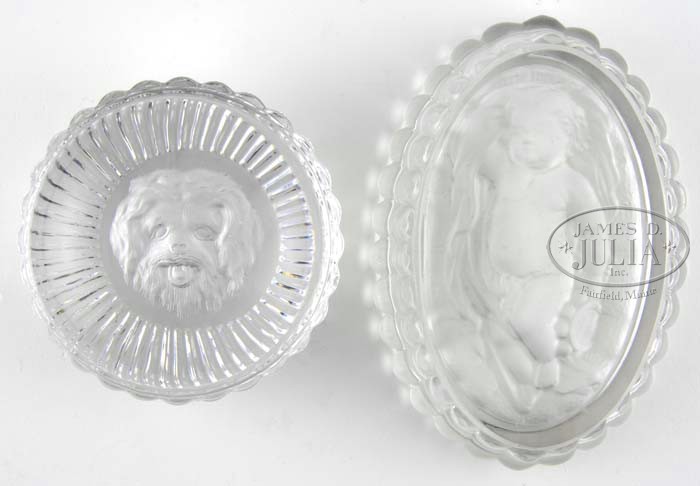 TWO AMERICAN PRESSED GLASS PAPERWEIGHTS. 1) Mt. Washington antique clear paperweight with a pressed dog’s face in the base. 2) Mt. Washington antique clear paperweight with a pressed figure of a sleeping baby in the base. SIZE: 3-1/4″ dia and 4-3/4″ l respectively. CONDITION: Both are very good to excellent. 5-63648 (200-300)