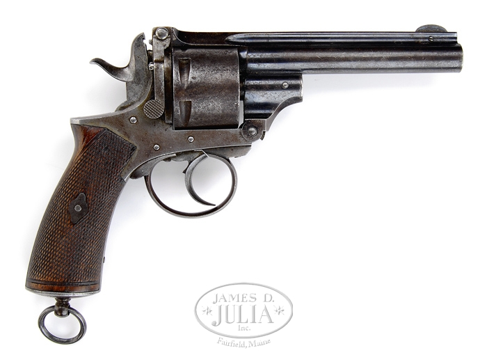 KERR DOUBLE ACTION REVOLVER SN NSN. Cal. 455 Eley. Fine late 19th century British military dbl action revolver with 5” keyhole bbl, half moon front sight with grooved bbl extension rear sight. It has an unfluted 6-shot cylinder with the Pryse dbl lever locking system and a rebounding hammer. Hammer has a notch at top that when fired engages a stud at back edge of bbl extension to prevent accidental opening upon discharge. It has checkered 2-pc walnut grips with a Le Mat-style buttcap with lanyard stud & ring. Bbl is engraved “JAS KERR & CO. LONDON”. Buttcap is engraved “H. ST DAVID JARRETT / 2ND 3RD Buffs”. The Buffs, as the regiment was known, was founded in 1572 and immediately assigned to Holland to fight Spain, where they remained for 76 years until Spain was defeated. In 1665 they returned to England and became the 4th Regiment in order of precedence, as a maritime regiment. In 1667 they became a land regiment with red tunics that had buff lining and with buff waistcoat, breeches & stockings where they naturally were named The Buffs, which eventually became official. In 1689 the 3rd Regiment before them disbanded and they were moved up in the order of precedence, which position they held until the 1990’s, over 300 years. They are now amalgamated into another unit and no longer are known as The Buffs. In 1782 their name officially became the “Royal East Kent Regiment (3rd Foot)”, the name they held until they were amalgamated. In every war in which England has fought, from their founding until amalgamation, the Buffs acquitted themselves with great distinction, winning many awards including several Victoria Crosses. Further research regarding Mr. Jarrett may prove worthwhile. CONDITION: Fine. Bbl retains 60-70% strong orig blue with balance a medium patina. Remainder of revolver has traces of finish in most sheltered areas being mostly a gray/brown patina. Grips show moderate to heavy wear and are sound. Mechanics are fine, bright shiny bore with a spot or two of pitting. 4-32902 JR536 (2,000-3,000)
