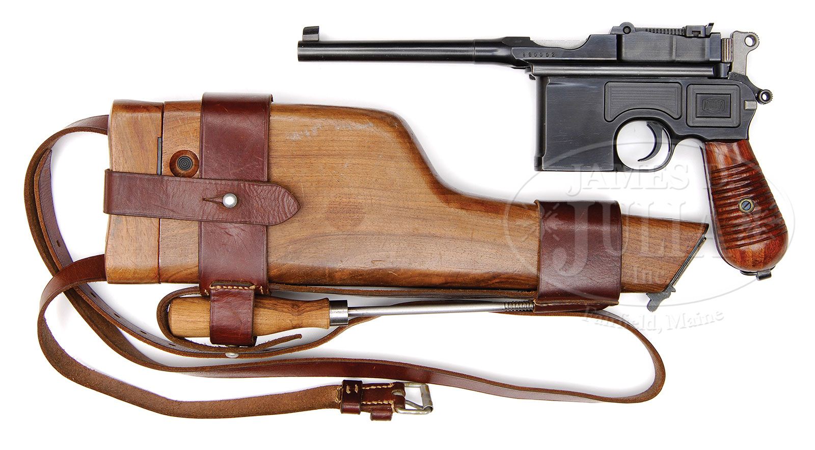 *SPECTACULAR MAUSER C96 M1930 COMMERCIAL WITH SUPERB M712 RIG. SN 890002. Cal. 7.63mm. Late M1930 Commercial with 5-1/2″ bbl and 50-1000 rear sight. Crown/”U” proof on left chamber flat and full SN on left side of bbl extension. Solid rails. All small parts salt blued except for fire-blued grip screw. Disassembly shows matching frame, sub-frame and mag floorplate. Unnumbered grips are correct for this variation. Complete with exceptionally nice, orig M712 stock and orig leather harness that is maker marked “SCHORK” on reverse side. Cleaning rod is a reproduction. PROVENANCE: Ralph Merrill Collection CONDITION: Superb pistol has better than 99% bright orig finish with only a few minute scuffs under bbl, leading edge of mag floorplate and on forward tip of each rail. Grips have nearly all orig varnish. A few scattered dings on each grip with most on lower portion of right panel. M712 stock is crisp and free of any cracks or repairs. Grooved for selector switch and lips of mag. Orig varnish with scattered handling marks. Orig fire-blue on hinge and unnumbered lug with straight corners as correct for this era of production. Excellent orig carrier is well marked on reverse with supple leather and no repairs to stitching. (C&R) 4-47270 LMA49 (3,500-5,500)