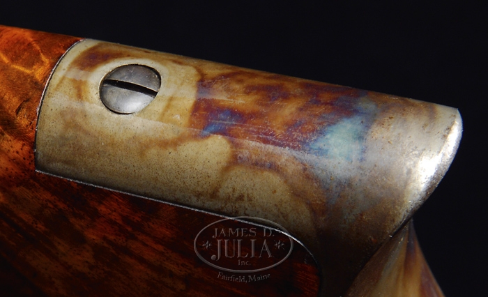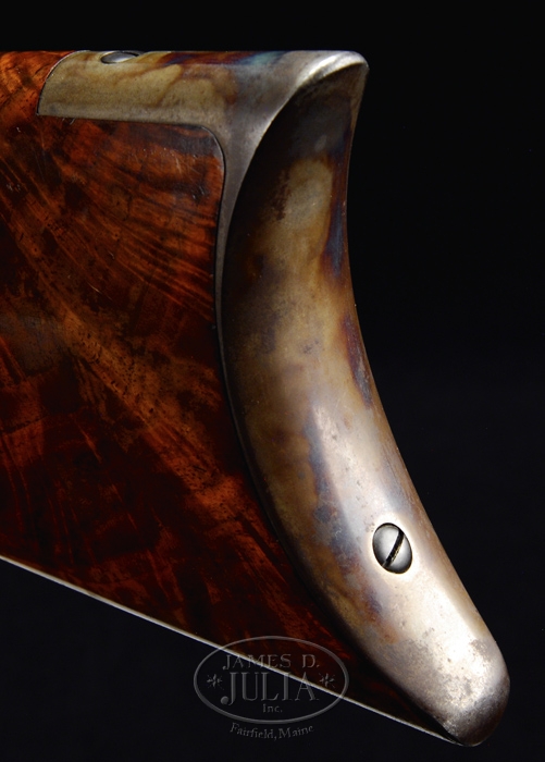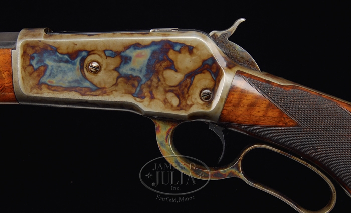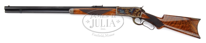 SPECTACULAR DELUXE WINCHESTER MODEL 1886 LEVER ACTION RIFLE SN 83471. Cal. 45-70. Beautiful 86 with 26” oct bbl, full magazine, half nickel front sight and “1886” marked ladder rear sight. It has sgl set trigger. Mounted with spectacular feather crotch American walnut with H-style checkered forearm and black insert serpentine pistol grip stock with crescent buttplate. CONDITION: Extraordinarily fine, appears to be unfired. Bbl & magazine tube retain 98-99% strong orig factory blue with a few tiny scattered freckles of light surface rust. Receiver retains brilliant case colors on sides and over top with bottom moderately faded and with some very minor fine surface etching. Lever & hammer retain all of their orig brilliant case colors and buttplate virtually all of its orig case colors, brilliant on tang & heel, slightly faded on toe. Forend cap retains about all of its case hardening, mostly faded but stronger on right side. Wood is sound with minor nicks & scratches and retains virtually all of its brilliant piano varnish finish with some slight crazing on left side of buttstock. Mechanics are crisp, brilliant shiny bore. Inside action & bolt face have heavy grease which appears to be factory original. 4-59906 JR319 (35,000-50,000)