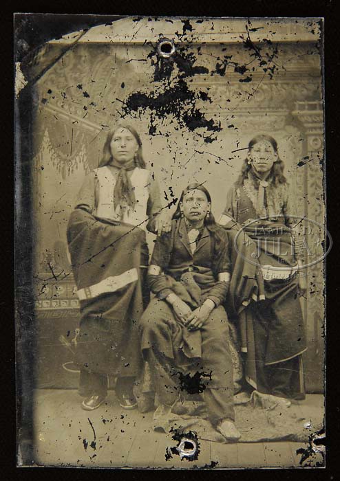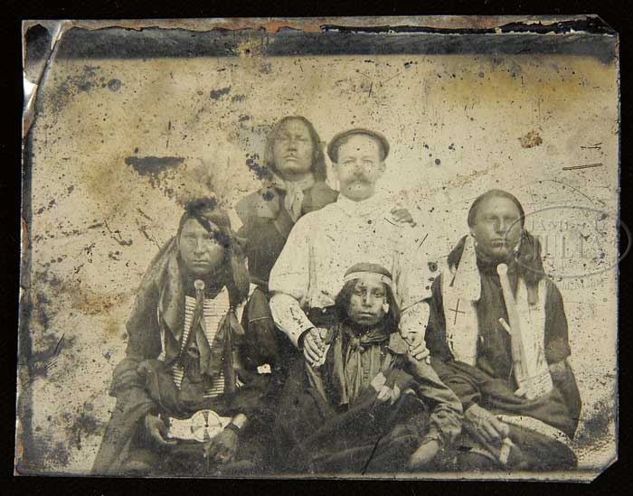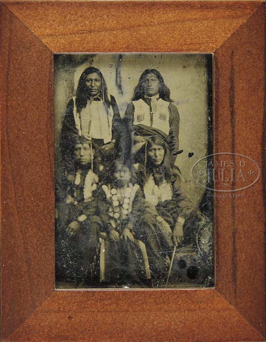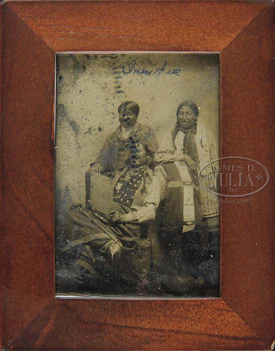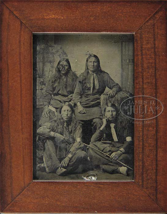 RARE AND UNPUBLISHED ANTIQUE LOT OF FIVE TINTYPE IMAGES OF PLAINS INDIANS. The tin-type process was generally antiquated by the albumen photo process but this type of photography was still in use (especially on the frontier) into the 1880s. In fact, the only known image of Billy the Kid is a tintype of similar size ca. 1879-1880. These photos date from the late 1860s to the 1880s. They are Plains Indians and, by their beadwork and dress, are probably Sioux and the images were obviously taken at a photographer’s studio or agency or at a fort with a photographer as two of them have typical painted photographers’ backdrops. There are five early tin types. 1) This tin type depicts four braves, two sitting on the floor, two sitting above. One is obviously an Indian policeman as he wears a six-point star. According to agency & fort policy, the Indians were allowed to keep the law among themselves policemen that were appointed by the commanding officer. This image is with a photographer’s backdrop. Each of the Indians are clad with government provided trousers and blouses, with some beaded ornamentation visible. 2) This image depicts three Indians. This image was obviously taken in a photographer’s studio or at a fort with a photographer’s backdrop set up. Two of the Indians are draped in blankets with what appears to be Sioux beadwork. One wears what appears to be trade bracelets on his arms. They are each wearing issued trousers and with scarves around their necks. 3) This interesting image depicts three figures, each wearing manufactured clothing. The Indian seated wears a shirt which appears to be decorated with Elk teeth, and he also wears a badge. He has a skull crusher resting on his knee and he holds a large sheet of paper which all three are looking upon and appear to be amused. Someone at one time scripted a title at the top which seems to read, “Iron Deer?” However, the Indian on the right who appears to be smiling, has a very close resemblance to Sioux chief Spotted Eagle. 4) Depicts five braves, one of which appears to be much younger than the rest. The braves wear trousers; two have bone breastplates; one with a beaded vest; and one with a large disc or conch-shell type necklace. A label, which at one time was affixed to the back of the tintype, lists a series of Indian names implying that they might be the names of the braves in the image. The list reads, “Top Row: Red Eagle, Goes to War, and Black Face. Bottom row: James Red Eagle, Joe American Horse, Assie Goes to War”. 5) This image depicts four Indian braves with a white man. The white man is unquestionably government or Indian agent or someone they are very familiar with. There is a famous photograph taken of the October, 1877 meeting depicting General Crook, various Indians and non-Indians. In this image the Caucasian who appears third to the right of General Crook looks very much like the exact person that appears in our tintype. He stands behind one Indian brave who is seated and both hands rest on either shoulder. An Indian standing behind him rests his hand on the Caucasian man’s shoulder. One Indian is dressed in a beaded vest; another with a bone breastplate and a beaded waistband. The Indians wear garments of trade cloth. This group of photographs was discovered together and as we indicated earlier, we believe them to be Sioux. In considering the fact that there is obviously a significant grouping of Indians, all of whom posed for their photo, and considering the approximate time period that the tintypes would indicate that these were made, it is speculated that these possibly could have been taken sometime after the Treaty of Fort Laramie in 1868. This treaty was an agreement between the United States and the Oglala, Miniconjou, and Brule bands of Lakota people, Yanktonai Dakota and Arapaho nation, which was signed in 1868. This treaty guarantee the Lakota ownership of the Black Hills and land and hunting rights in South Dakota, Wyoming and Montana. The Powder River was from that point forward supposed to be closed to all whites. The signing of the treaty in 1868 ended Red Cloud’s War, but the effect was short lived. By the 1870s the United States decided that it once again wanted the Black Hills, and in 1877 they seized the black hills back again. It is possible that these very same braves left the reservation to fight with Sitting Bull and Crazy Horse against the 7th Cavalry. This is a very rare offering on the public market. SIZE: These are each approximately 2-½” wide and 3-½” high. CONDITION: Three have nail holes; all have a fair amount of abrasion, scrapes and rubs over the surface of the images and show great age. 4-45608 (25,000-35,000)