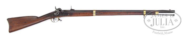 CONFEDERATE FAYETTEVILLE 1864 RIFLE. SN NSN. Cal. 58. You are bidding on one of the most popular Civil War Confederate rifles. This gun made in 1864 at the Fayetteville Army was made from captured Harper’s Ferry machinery taken from the US Armory in 1861. Lock on this gun is marked forward of hammer with an eagle over “CSA” and “FAYETTEVILLE”. Rear of hammer is marked “1864”. Bbl date is not discernible, however the “VP” over eagle head is visible. This gun is brass mounted including nose cap, trigger guard, buttplate and bbl bands. The buttplate is correctly marked “CSA”. Inspector’s cartouche on the stock is still visible but the letters are not discernible. The gun is complete including a tulip ended ramrod. CONDITION: Bbl has been bored out, there is no rifling. Bbl has been cleaned and refinished. There is a welded repair at breach. Rear sling swivel is replaced. Stock has been sanded such that shoulders no longer have crisp edges. Stock overall is sound and complete. A 3″ crack is present in stock behind rear band at ramrod channel. 4-39536 JS30 (8,000-12,000)