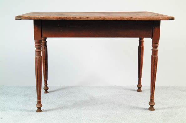EARLY 19TH CENTURY TAVERN TABLE. One board top with breadboard ends. Having fluted legs, the base in old red wash. SIZE: 42” l x 27” w x 27-1/2” h. CONDITION: Generally good. 3-30428 (1,400-1,800)