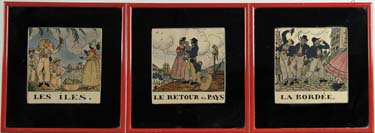 SET OF THREE FRENCH PRINTS. Colored prints by Guy Arnoux. Titled “La Bordee” which shows three sailors drinking on a city street. “Les Iles” which shows three sailors coming ashore meeting islanders. “Le Retour au Pays” showing a sailor reuniting with family. Identically housed in a painted red wood frame and 2-1/4” mirror matte. SIGHT SIZE: 8-1/2” x 8”. CONDITION: Very good. 12-300 (150-300)