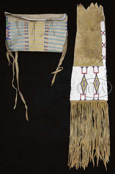 COLLECTION OF 19TH CENTURY PLAINS INDIAN ARTIFACTS ASSEMBLED BY LYDIA PARRY TEASDALE. 1) A WONDERFUL 19TH CENTURY SIMULATED BEARCLAW NECKLACE. The necklace shows great age and was constructed around a necklace of large trade beads. The trade beads were strung and then wrapped with rawhide and mounted within the rawhide are the simulated bear claws. The bear claws are actually carved Elk bones in the shape of bear claws and painted with red ochre. The piece is completely center sewn. SIZE: Approx. 17” from bottom to top. The orig old Parry Museum tag is still intact with the number 2886. CONDITION: Approx. ten of the simulated bear claws are either missing or damaged. The piece is still intact and shows considerable age. 2)A SMALL 19TH CENTURY CARVED BONE AND NEEDLECASE WITH SINGLE HANGING STRAP INTACT. It has simple carved ribbed designs in the bone. The bone is also marked with the Parry Museum i.d. “Parry col 2884”. SIZE: Approx. 5” long with the wooden awl or needle. CONDITION: Generally Good. 3) A SMALL POTTERY EFFIGY SEAL. The figure is hollow and has the appearance of great age. The overall surface has a dark, discolored patina. The face of the seal with two small openings for the eyes and a large oval opening for the mouth. It bears a museum number on the underside 2879. SIZE: This small rotund figure is approx. 3” long. 4) UNUSUAL FEATHER AND SHELL 19th CENTURY CEREMONIAL NECKLACE PERHAPS FOR A SHAMAN. The rawhide wrapped, center sewn necklace has multiple small periwinkle type shells attached to it, and also suspended from numerous black feathers with an iridescent green sheen. These are perhaps small turkey feathers. Retains a Parry tag with the number 2885. 5) 19TH CENTURY TURTLE SHAMAN’S RATTLE WITH HOOF DANGLES. The turtle rattle with the rawhide bands still in place and having suspended from its end seven small antelope or deer hooves. The turtle shell with two drilled holes on the underside; one drilled hole on the upper side; and a large hole that appears to have been broken out perhaps at the time the turtle was killed. Retains the museum’s Parry tag on the underside of the shell with number 2714 South-East. The size of the turtle shell is approximate 5-1/2” long. CONDITION: The shell has a wonderful, old, much-used worn patina and most of the hooves danglers are intact. 6) 19TH CENTURY DREAM CATCHER WITH HOOF DANGLES. The wooden ring has five antelope or deer hooves suspended from it and appears to be wrapped with strands of alder root. One of the hooves has a museum number affixed to the side, 2904. SIZE: 6-1/2” in diameter. 7) AN INDIAN CHIPPED ARROWHEAD. A museum number of on the underside, 2914. 8) LARGE PLAINS INDIAN ADZ OR 19TH CENTURY HIDE SCRAPER. Leather covered iron blade, attached to a large bone (probably a buffalo large bone)handle . Old label reads “Alaska Eskimo Children’s Museum”, last quarter 19th C. SIZE: Approx. 11-1/2″ l. CONDITION: Good. 9)INDIAN BEADED HIDE BAG. 19th C. Bead decorated pipe bag. Sinew sewn multi color bead work in diamond and square geometric designs on white background. Top edge is also decorated with a single row of beads, long fringe extends from bottom. SIZE: Overall with fringe 32″ h x 7″ w. CONDITION: Overall very good. 10)INDIAN BEADED HIDE BAG. 19th C. Plains Indian possible bag with horizontal bars of multi color bead work decorate front and flap of bag, hide straps extend from rear sides. SIZE: 8″ h x 12″ w. CONDITION: Good with very slight missing bead work. 11) INDIAN BEADED HIDE BAG. 19th C. Plains Indian hide tepee bag. Side edges are decorated with multi colored geometric sinew sewn bead work designs along with tin cones with horsehair fringe, old label reads “2735” on back side. SIZE: 17″ x 22″ w. CONDITION: Overall good. 12) SOUTHERN PLAINS INDIAN LEGGINGS. 19th C. Child’s or ladies size, decorated with yellow paint along with gold colored trade beads. Also a bead work design on outside edges and red painted hide fringe.SIZE: 20″ l x 8″ w. CONDITION: Area of discoloration and staining is evident on both leggings. Glass trade beads are missing from one legging. 13) PLAINS INDIAN BEADED CANVAS CRADLE COVER. 19th C. Upper section of hood is decorated with rows of sinew sewn multi-color bead work along with green tufts of wool, old label reads “M C 83/100 M”. Sides and back are undecorated canvas. SIZE: Overall 36″ h x 28″ w. CONDITION: Overall good, very few missing beads. 14) PLAINS INDIAN MOCCASINS. 19th C. Very soft dark smoked hide, decorated with circular geometric design in blue and red beadwork on each vamp. SIZE: 9″ l. CONDITION: Overall good. 15) PLAINS INDIAN AWL CASE. 19th C. Fully beaded in white, red and blue seed beads, with hide fringe at bottom. SIZE: 12″ l, including fringe. CONDITION: Good. 16) 19TH CENTURY SIOUX HAIR DROP. 7 rows of quill decoration with dyed blue horsehair fringe. SIZE: 13″ l plus fringe. CONDITION: Fair, some missing quill work. 17) TWO PLAINS INDIAN FETISH AMULETS. Both are fully beaded with geometric designs on hide, fringe extends from both ends. SIZE: 5″ and 4″ l. CONDITION:Good. 18)PLAINS INDIAN HIDE KNIFE SHEATH. Red and white sinew sewn bead work covers the front, tin cones are attached to fringe, rear side shows traces of old red paint. SIZE: 9″ l. CONDITION: Overall good, slight fringe loss, slight stiffness to hide. 19) 19TH CENTURY NATIVE AMERICAN GOURD RATTLE. Gourd measures 6″ in diameter, with handle length 9″. Wooden handle drilled through gourd, with seeds inside gourd. 19th C. Stamped with old Museum No. 2913. CONDITION: Crack in gourd near top of the handle. 20) 19TH CENTURY PLAINS INDIAN CONCHO BELT. Leather decorated with 11 German silver Conchas, each concha is approximately 3″ in diameter, total length of belt is 40″. Belt is accompanied with an old hang tag. CONDITION: Leather portion of belt shows wear and tear, with rub and cracking due to wear. 21) 24″ PLAINS INDIAN DRUM. Large p