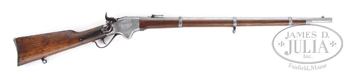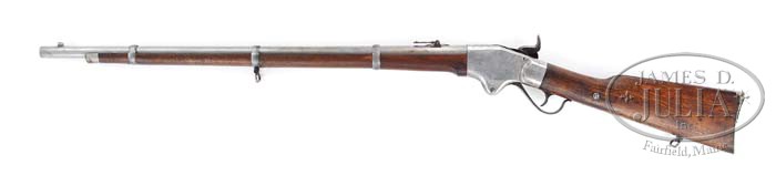 HISTORICAL SPENCER MODEL 1860 LINKED TO THE MICHIGAN 5TH CAVALRY. SN 1061. Cal. .52. (The following is the description written by Wiley Sword for Julia Auctions Oct. 1999 Lot # 14, for this Firearm when it was sold as lot 14.) An outstanding historical weapon, this Spencer Army rifle was most certainly part of the first shipment from the factory about December 1, 1862. Although 750 Spencer Navy rifles and perhaps 250 sporting Spencers carry lower serial numbers, records show the 500 army rifles shipped to the 5th Michigan Cavalry in Detroit were the first to leave the factory. This was part of the first War Dept. contract of June 19, 1862 for 7,500 army rifles with angular bayonets @ $40 each. Although the contract specified that 1,000 rifles were to be delivered in July, the first delivery occurred more than four months later. These 500 rifles, the first portion of an Ordnance Dept. assignment of 1,200 Spencers to Col. Joseph T. Copeland’s 5th Michigan Cavalry, were shipped to Detroit, and arrived on December 5th. Yet they were one day too late! The Detroit Advertiser & Tribune of Dec. 6th duly reports the arrival of the “first” Spencers manufactured, but the 5th Michigan Cavalry had left via railroad for Washington, D.C> on December 4th. These rifles thus had to be reshipped there, Accordingly, it was the end of December before the 500 Spencers caught up with the regiment at “Camp Copeland” (see my article “Those Damned Michigan Spencers” in Man at Arms Magazine, Sept./Oct. 1997, pp. 23 ff.) All but Co.’s K and E were issued these first lot of Spencers, Additional shipments in lots of 100 were received during January 1863, with about 200 to 300 going to the 5th, and about 400 or 500 being issued to the 6th Michigan Cavalry (Co.’s A,C,D,E,H, and possibly G). The basis fot the 5th Michigan Cavalry being the first to receive Spencer rifles is traced back to June 1862, when Lt. Col. Copeland, then of the 1st Michigan Cavalry, proposed to raise a regiment of “mounted riflemen or sharpshooters.” During the summer of ’62 Copeland organized his unit, designated the “1st Michigan Mounted Rifles,” but had to wait for the desired Spencer rifles to be manufactured, Michigan Governor Austin Blair and others soon put heavy pressure on the War Dept. and the Chief of Ordnance, Brig Gen James W. Ripley. Since Ripley was not in favor of repeating rifles, he nearly canceled the long overdue contract. Hence the Spencer firm’s urgency in first getting out the army rifles. Copeland’s regiment was assigned to the defenses of Washington, D.C., but together with the 6th Michigan Cavalry, they joined the Army of the Potomac prior to the famous cavalry action at GETTYSBURG. Copeland was relieved from command of his brigade due to political circumstances, and newly appointed Brig. Gen. GEORGE A. CUSTER lead the “Wolverines” in furious fighting against J.E.B. Stuart’s cavalry at Gettysburg on July 3rd. The 5th Michigan’s Spencers proved to be important in the hard fought victory of the Michigan Cavalry brigade at Rummel’s Farm that day. Due to the almost continual combat action of the brigade throughout 1863, and continuing to into 1864, these Spencers were subjected to very arduous service. Many worn out, lost, or damaged rifles were replaced with Spencer carbines beginning in early 1864. As such, few of the orig 500 Spencer rifles appear to have survived. Roy Marcot, author of Spencer Repeating Rifles, states in a personal letter April 23, 1985 that “true Spencer M1860 Army rifles in the low 1000 to 1500 serial number range are almost non-existent. In fact, in my six year survey of almost 3,000 Spencers (plus Tom Lewis’s 20 year search) only two showed up in this range.” Spencer Army rifle #1081 (ten numbers removed from this rifle) is owned by the great grandson of George W. Hood of Co. B, 5th Michigan Cavalry. Based upon documented and recorded serial numbers, the first “army” lot of 500 approximates the 1000 to 1500 serial number range. PROVENANCE: Charles Radcliffe Collection; ex-Wiley Sword Collection. CONDITION: This rifle has survived in good but well used condition. Certain parts (including receiver) have been polished and refinished. Matching numbers “1061”, are stamped on the bbl and receiver. The forearm is a replacement from another orig Spencer rifle. AS a very rare survivor of the orig lot Spencer rifles issued to the famous 5th Michigan Cavalry of Custer’s Michigan Brigade, this is an artifact of much historical significance. Indeed, its story is hard to exceed-one of the best Civil War firearms from perhaps its most famous cavalry organization, linked to CUSTER and GETTYSBURG! A rare find! 4-39628 BDT171 (4,000-6,000)