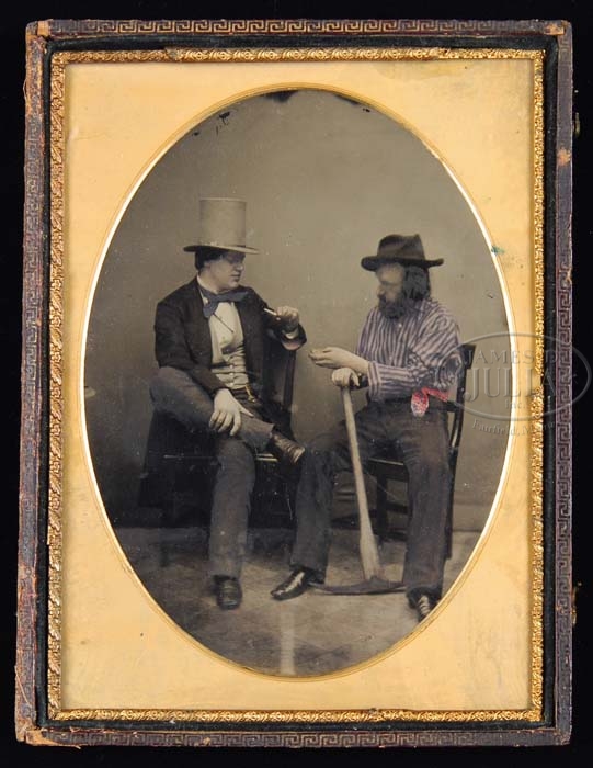 1/2 PLATE AMBROTYPE OF TWO IDENTIFIED BROTHERS FROM GOLD RUSH ERA ONE HOLDING GOLD NUGGET AND MINERS PICK CIRCA 1860s. Purportedly these two brothers names are Keast they are from Penzance, Cornwall, England, and traveled to the California gold rush diggings in the early 1850s, made their fortune and returned home in the 1860s. The brother on left is wearing a great stove pipe top hat, holding a pipe in left hand, and wearing gold rings on both hands. Around his waist he has a huge gold nugget watch fob & chain. The brother on right is wearing slouch type hat, has longhair and full beard. He is also wearing a gold miners striped shirt, with fancy colored gold poke? around waist. Brother on right is leaning on gold miners pick showing the other brother a large gold nugget, as they both stare intently at it. Great large format for ambrotype. This early ambro is housed in leather covered wooden case with tin frame. SIZE: Photograph approximately 4-3/4” x6-1/2”, case 5-1/4” x 7”. CONDITION: Ambro has small clear spots on back. Leather case is separated, and has heavy wear. 4-87597 (10,000-20,000)