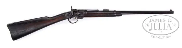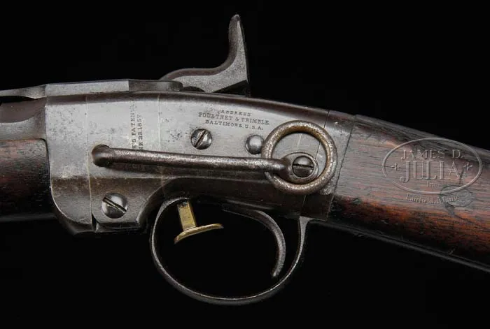 CIVIL WAR SMITH CARBINE IDENTIFIED TO 1ST ALABAMA CAVALRY, US. SN 11137. Cal. 50. You are bidding on a gun that is all original, identified via Springfield research to Sgt. Madison M. Barton. Madison Barton was a farmer from Hall County, Georgia who enlisted in the US Cavalry in Fayette, County Alabama in Sept. 1863. Barton also had four brothers and three brothers-in-laws who served in the same regiment Company L 1st Alabama Cavalry, USV. Records in the Army Adjutant General’s office show that this carbine, 11137, was issued to Sgt. Madison M. Barton. This record is stored in the National Archives under Record Group 94, Entry 112. The 1st Alabama US Cavalry was a hard fighting unit made up of Southerners with strong Union ties who saw the Confederacy led by a group of rich planters who only wished to preserve slavery. The 1st Alabama Cavalry was centered in Winston, Alabama where many of the locals referred to themselves as “The Free State of Winston” due to the anti-seccession feeling early in the war. 1st Alabama Cavalry fought with distinction with Sherman all through the Atlanta Campaign and were prominently involved in Streight’s Raid into northern Alabama. When the 1st Alabama cavalry mustered out of service in 1865 only 397 men remained including Madison Barton. In 3 year service the regiment lost 345 men killed in action, died in prison or of disease; 88 became POWs and 279 deserted. Many of these Alabama troopers suffered after the war for their loyalty, legally, politically and socially. You are bidding on a rarely offered identified US issued weapon to an individual soldier. Accompanied by a copy of “First Alabama Cavalry U.S.A.-Homage to Patriotism” by Glenda Mc Whirter Todd. CONDITION: Metal overall brown with scattered rust and pitting. Bore still exhibits good rifling. Markings and serial numbers all deeply struck and easily read. Inspector’s cartouche well struck and easily seen. Forestock and buttstock exhibit numerous dings, dents and scratches. Clean-out screw appears to be a replacement. 4-40098 JS48 (2,000-3,000)
