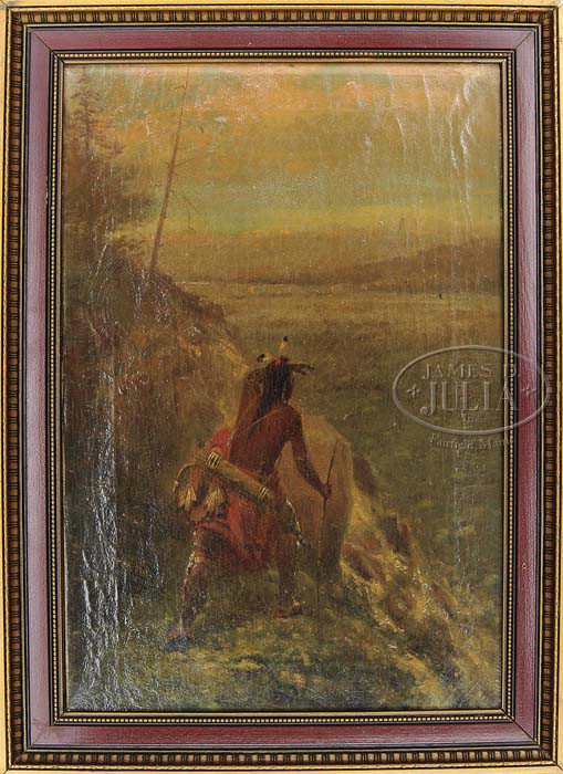 TWO OIL PAINTINGS OF INDIANS BY AUGUST H. BECKER “1840-1903”. Becker was born in Germany, but as a very small child moved to the United States and lived much of his life in Missouri. He became an accomplished artist along with his famous half brother Karl Wymar, together they painted the Frescoed Dome in the old Court House in St. Louis in 1861. Becker’s works on various museums including the Missouri Historical Society, the Montana Historical Society, and others. This lot consists of two paintings by Becker. 1) Oil on Canvas of and Indian brave with quiver and bow on a hill observing a distant wagon train. The painting signed and dated in the lower left “A.H. Becker 1890”, the oil painting framed in a later gesso frame. 2) Oil on canvas board painting, full frontal portrait of a standing Indian Chieftain with floor length headdress holding a peace pipe in one hand and a small skull cracker in the other, dressed in buckskins and leggings with quill work decoration. Signed in lower left “A.H. Becker 1889”. The reverse of the canvas board stamped “Russel’s Canvas board March 18, 1879”. SIZE: 1) 20-3/4″ h x 13″ w (painting together with frame 25″ h x 18″ w. 2) 16″ h x 10″ h (with frame 19-1/2″ by 13-1/2″). CONDITION: 1) Overall craquelure and in need of a cleaning, otherwise generally very good. 2) There are some scattered tiny white specks on the painting, perhaps as a result of some scratches at one point in time. Painting is overall soiled and in need of cleaning, otherwise generally good. 4-46245 JJ3 (9,000-12,000)