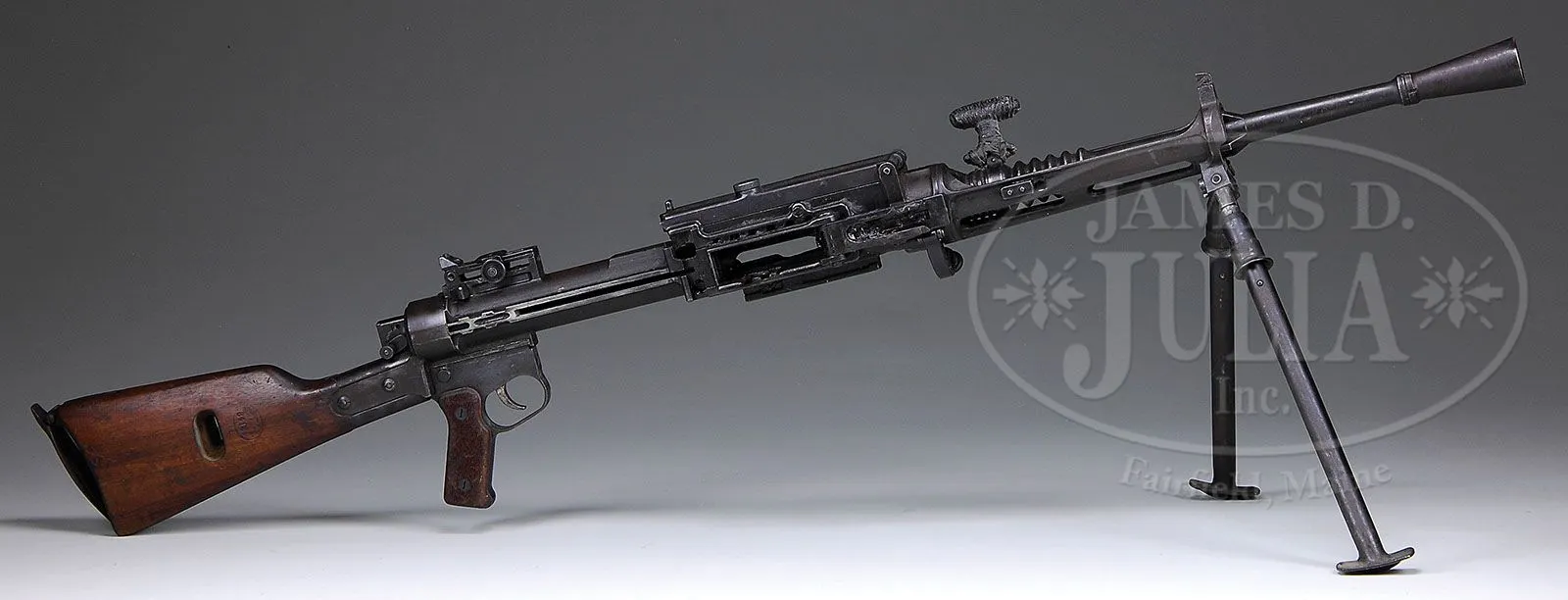 **ITALIAN BREDA MODEL 30 LIGHT MACHINE GUN DEWAT (C & R). SN 84134. Cal 6.5 Carcano. Bbl length is 20-1/2″ with flash hider. Manufactured in 1944, this Breda 30, was rather unique for a light machine gun. It was fed from a fixed magazine attached to the right side of the weapon and was loaded using brass or steel 20 round stripper clips. If the magazine or its hinge/latch were damaged the weapon became unusable. It also fired from a closed bolt along with using blowback for its action. Gun is missing the magazine and the chamber is welded shut. The bbl does remove freely. Bolt assembly is not present. Cocking handle is not present. Bbl locking assembly within forward receiver is present. Trigger does actuate. This weapon is currently unserviceable. PROVENANCE: Recently deaccessioned from the Rochester Museum & Science Center Collection. CONDITION: Overall finish and appearance is fine with 90% blue finish, thinning in some places with some spots of corrosion. Stock is in very good condition with cartouche indicating “BREDA-ROMA”. Serial numbers appear matching. Top cover opens and closes freely and there is brown grease in the action. Unable to determine condition of bore due to welding of chamber. Bi-pod legs extend perfectly. A little work on the chamber and the addition of parts from a parts kit and this weapon could likely be brought into a firing condition. 4-47154 JWK8 (2,500-3,500)
