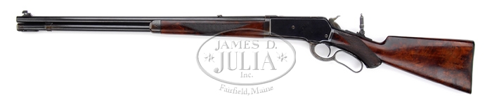 *WINCHESTER MODEL 1886 DELUXE TAKEDOWN LEVER ACTION RIFLE SN 145381. Cal. 33 WCF. Standard 24″ round light weight bbl, with full mag takedown. Front sight is a replacement Marbles #3 with large flip down white bead to a finer mounted gold bead. Rear sight is a King flip down with set screw. Tang has marbles locking peep sight. Mounted with “XX” American walnut, with checkered pistol grip and grip cap, and hard rubber shotgun buttplate. The lower tang shows assembly #750 and “XX”. Cody Winchester letter identifies this rifle as 33 cal., round bbl, plain trigger, full mag, checkered stock, pistol grip, shotgun butt, rubber buttplate, Lyman front sight, received in warehouse on Jan 6, 1909, and shipped from warehouse Jan 6, 1909. CONDITION: Fine. Bbl and mag tube retain 75-80% orig. blue with some thinning and turning a blue/brown patina. Forend cap has flaked to about 30% blue and balance being a brown patina. Bbl takedown ring has been worn to mostly a brown patina with traces of orig. blue showing. Receiver has 85-90% orig. blue finish blended with blue/brown patina and wear on the sharp edges. There is a light peppering effect of spots turning to patina across the receiver in the carrying area. The lever has visible colors with the balance being a silver hardening appearance. The hammer has most of its orig. color, with silver showing through on the bearing areas. Stock is sound with its usual light nicks and dings, and has the appearance of it is factory finish with the possibility of it being rubbed with wax. It does appear that there is a plugged swivel hole in the toe line of the stock with finish being added to this area years ago. Overall, the stock is nicely figured, and carries an aging, hand worn patina. Forend is sound with just a few light handling marks, and showing a lovely hand worn patina finish. Checkering is good, with some darkening from age. Mechanics are crisp, bore is bright with only a few light scattered pitts. 4-33299 BT80 (10,000-14,500)