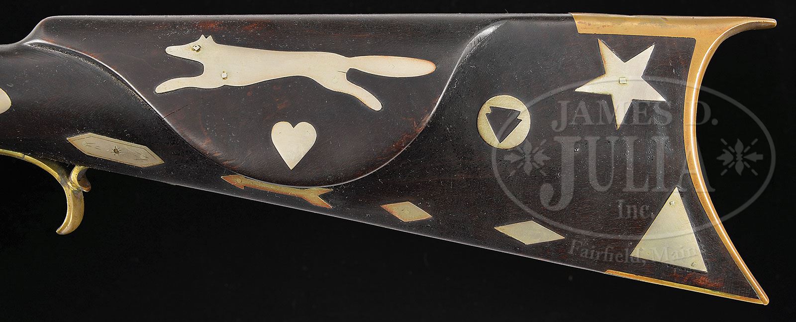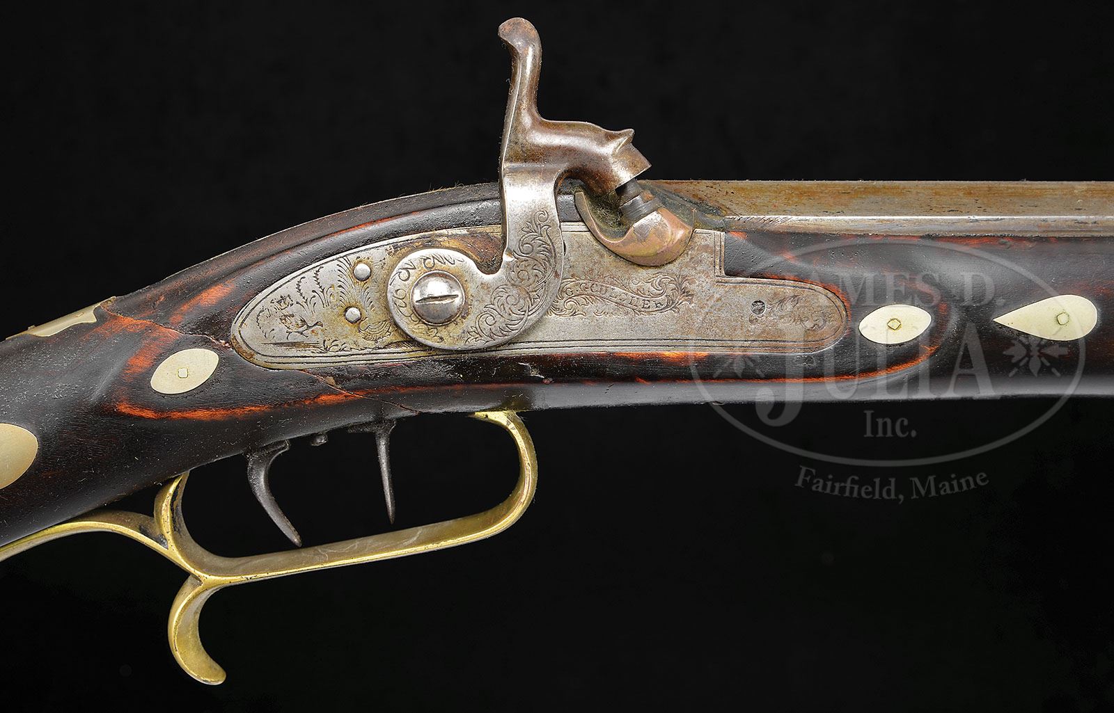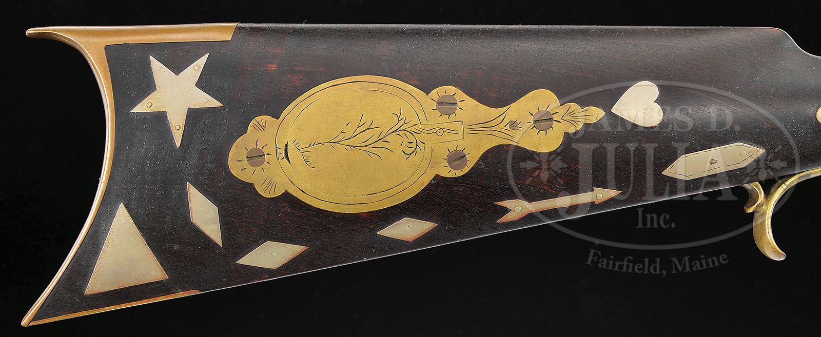 HIGHLY INLAID PERCUSSION OHIO KENTUCKY RIFLE ATTRIBUTED TO HARVEY GILMORE. SN NSN. 33-3/4″ full oct rifled 45 Cal. bbl stamped “H. M. Gilmore”. Rifle has forty-one silver inlays including the running fox cheek inlay. Lock is made by G. Golcher of Philadelphia and the rifle has double set triggers. Brass cap box is engraved and held in with four screws. Stock appears to be curly maple but is finished dark. Gun is attributed to Harvey Gilmore of Williams County, Edgertown, Ohio circa 1859-60. CONDITION: Generally good. Rifle is cracked at the wrist and one oval silver inlay is missing on the cheekpiece side. Lock needs adjustment. 4-49142 RG77 (3,000-4,000)