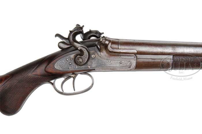 UNIQUE 14 BORE BREECHLOADER BY SAMUEL HART OF MENASHA, WI & TOMBSTONE, AZ. SN NSN. Cal. 14 ga. Chamber diameter: .770. Bore diameter .670. 29″ Damascus bbls converted from percussion by the addition of a heavy shoe lump and extractor system. Bbls still retain two plain ramrod pipes holding ebony ramrod with brass head and tail. Hand-filed top lever action with Purdey type dual under lugs incorporates orig muzzleloaders bar locks, fitted with high serpentine carved hammers with sculpted eagle heads marked “S.L.Hart” on right lockplate, and “Menasha” on left, both in scrolled ribands. Action is engraved with line and diamond borders with simple foliate flourishes. Orig muzzleloaders trigger guard has shore bird engraved in central oval flanked by acanthus. Lockplates have open scroll shaded engraving, possibly done by Mr. Hart. Water table is stamped w/ trademark “SL” over Hart logo on one side, and “Menasha” on the other. Dense, stump figured American walnut semi-pistol grip buttstock measures 14″ over steel buttplate with long top spur, engraved with open shaded scroll. Coarse flat top checkering extends past pistol grip and has broad mullered borders. Matching stubby splinter forend attaches to bbl with side nail through oval silver escutcheons and retains orig muzzleloading thimble. The work performed in the conversion of this muzzleloader shows a high degree of skill and workmanship. Bore diameter: left-.767, right -.768. Wall thickness: left -.021, right -.020. Drop at heel: 3-3/8″, drop at comb: 2-5/16″. Weight: 7 lbs. 11 oz. LOP 14″. Samuel Lombard Hart was born in 1830 in Solon, Ohio. At a young age he apprenticed to a local gunsmith and later opened his own gunsmith shop with his father in Menasha, Wisconsin. He continued in the trade until July 1861 when he enlisted as a 2nd Lieutenant in Company C Wisconsin 10th Infantry. He resigned on Sept. 14, 1862 and re-enlisted on June 9, 1864 as a Captain in Company D 41st Wisconsin Infantry and was mustered out in Sept. 1864. Family legend states that he also served as an Assistant Signal Officer for the 4th Division of the Army of the Tennessee seeing action in several battles including Pittsburgh Landing, The Siege of Corinth and Forest’s Raid into Memphis. At Pittsburgh Landing he was under heavy fire as a bearer of dispatches to Gen. Buell. Upon leaving the Army Mr. Hart resumed his gunsmith trade and with his brothers moved west, eventually settling in Tombstone in about 1880 opening his gunsmith shop on Fremont St. in Tombstone. He witnessed the famous Gunfight at the OK Corral and undoubtedly repaired and sold firearms to all the local residents. He remained in Tombstone until 1889, moving to Tucson, AZ, where he died in 1893. Mr. Hart is more famously known for his alteration of surplus Colt Cavalry single action revolvers, some of which have recently come to the market. They all show his fine gunsmithing skills which are certainly apparent in this shotgun. PROVENANCE: Letter of provenance from family member who inherited this fine shotgun, relating its history, and that it was Hart’s personal shotgun, regimental history of the 41st Infantry and Capt. Samuel L. Hart. “Find a Grave” documentation with history of finding tombstone for S. L. Hart in Tucson, AZ. CONDITION: Very good to fine. Bbls retain some of their orig Damascus brown with a number of areas of cleaning, and darker brown. Action is mostly silver to brown. Locks retain considerable amount of what appears to be orig case hardening color. Stocks retain most of their orig oil finish, some grain raised, checkering showing some slight wear. Bores are very good to fine with some slight pitting toward breech and numerous light longitudinal hairlines. Action is tight. Bbls are on face. Locks are good. 4-45025 MGM203 (6,000-10,000)