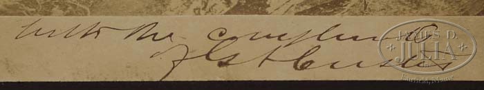 DESIRABLE GEORGE ARMSTRONG CUSTER PRESENTATION, AUTOGRAPHED ALBUMEN PHOTOGRAPH WITH FIRST GRIZZLY BEAR. This very scare and desirable photograph depicts George Armstrong Custer with what he claims to be the biggest hunting success of his life. This large grizzly bear was harvested on Custer’s 1874 expedition into the black hills. The expedition was launched after several rumors surfaced that gold and other valuable minerals might exist in the black hills. Custer was an avid hunter and on this expedition used some of the time to bag indigenous game. In this shot he posses with his Indian Scout, Bloody Knife, Custer of course, a short while later would be killed in the massacre on the Little Big Horn. Captain William Ludlow and Custer’s orderly Private Nunan, also appear in this image, as do some wagons and tents in the background. Also inscribed on the reverse of the photograph is “J. H. Beard”. We are told that James Henry Beard(1811-1893) was a famous American artist who specialized in animal genre paintings and portraits, and during his lifetime he had painted several of the more famous people of the era, Custer included. There was a famous image of Custer with a large dead bull elk and apparently one of those images bear a similar inscription on the back implying that Custer gave this famous artist these two photographs of his success. Mounted and framed in an antique style frame. SIZE: Size 6-3/4” w x 9-1/2” h, (including frame 16-1/4” w x 20” h). PROVENANCE: Acquired directly from Custer family. CONDITION: The autograph is strong and bold, the image itself overall has some toning and slight surface soil. There are 4 or 5 small spots of stain on the image, two of which are in the hind quarters of the bear, one at the very top edge of the image and one to the top left. A rare and desirable large image of Custer. 4-45090 JJ4 (15,000-20,000)