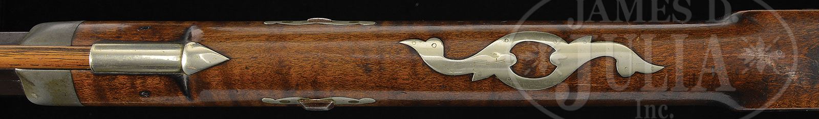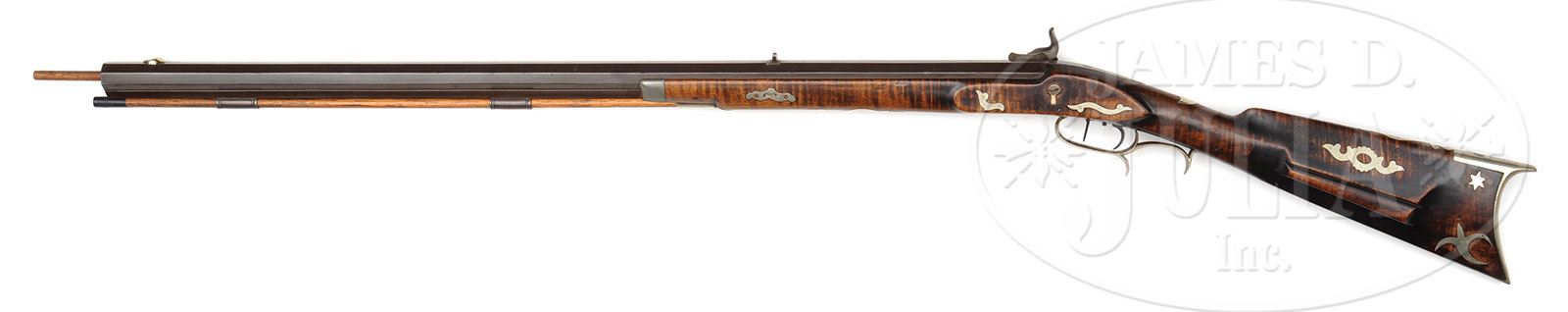 SILVER MOUNTED HALF STOCK KENTUCKY RIFLE BY J.A. McLAUGHLIN OF TOPEKA, KANSAS. SN NSN. 30-1/4″ full oct .40 Cal rifled bbl marked “J.A. McLAUGHLIN”. Engraved percussion lock is marked “J.H. VAJEN INDIANAPOLIS, INDa”. All silver mounted with silver buttplate, toe plate, trigger guard and rear ramrod ferrule. Bbl held to stock with one bbl wedge surrounded by silver inlays. 11 additional silver inlays decorate the curly maple stock. This is a hard to find gun from the Kansas area. CONDITION: Very good. Gun is in complete and working condition throughout. Missing a few small inlay pins. 4-49151 RG107 (3,500-5,000)