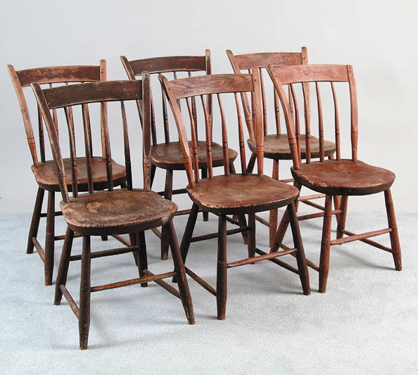 SET OF SIX RABBIT EAR THUMB BACK SIDE CHAIRS. Old worn red paint, appear to be a matched set having four tapered spindle backs, box stretcher and bamboo turnings. Uneven rustic finish. SIZE: 33” h x 17” seat h. CONDITION: One rabbit ear broken, otherwise good. 9-95214 (600-800)