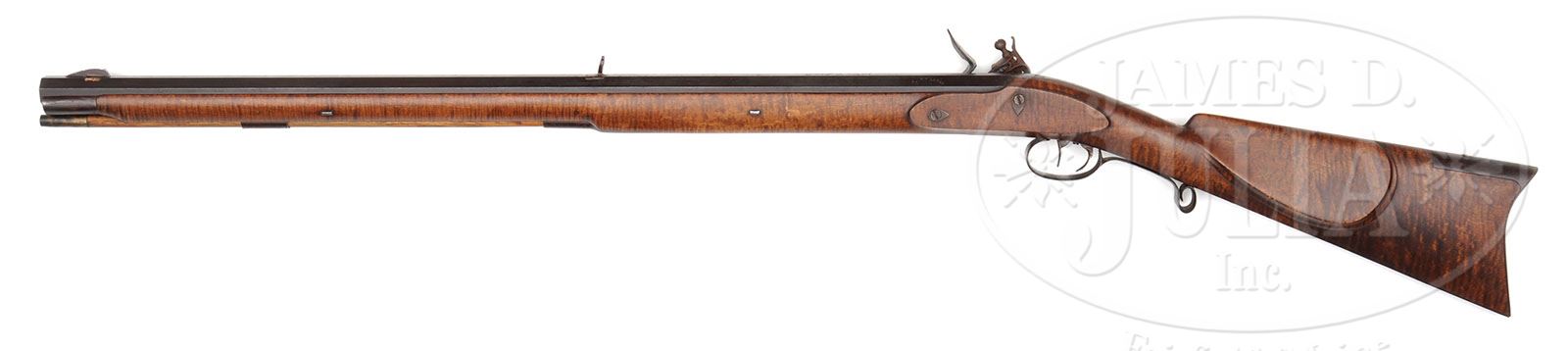 HAWKIN RIFLE USED BY CHARLTON HESTON IN THE FILM “THE MOUNTAIN MEN”. SN NSN. This contemporary J&S Hawkin rifle was used by Charlton Heston in the film “The Mountain Men”. It is a fancy striped curly maple stocked .58 Cal flintlock rifle. The swamped bbl was made by Bill Large and it’s builder was John Speak who is a builder of muzzle loading rifles and a consultant to the film industry and History Channel. Charlton Heston was trained in the use of this rifle by Phil Spangenburger, noted historian, author, and film consultant. This rifle comes with a photograph showing Phil Spangenburger, Jerry Crandall (noted frontier artist and reenactor) and Charlton Heston holding this very same rifle during filming. This rifle was purchased by the consignor directly from Mr. Spangenburger. CONDITION: As new throughout. 4-49664 RG116 (3,000-5,000)