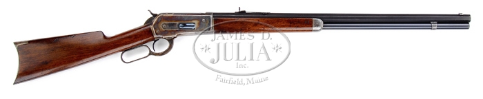 WINCHESTER 1886 LEVER ACTION RIFLE. SN 102875. Cal. 45-70. Standard 26″ oct bbl with full mag, half nickel front sight with set screw. Serrated side V-notch sporting rear with set screw. Mounted with uncheckered, straight grain American walnut straight grip with crescent butt. Accompanied by Cody Firearm Museum fact sheet fully identifying this rifle as being received in warehouse July 13, 1895 and shipped from warehouse Aug. 24, 1895. CONDITION: Fine. Bbl and mag tube retain 80-85% original blue with balance being a blended brown patina and has a few of the usual storage marks. Front mag tube retaining ring has traces of original blue flaked to leave a light brown patina. Forend cap has visible case colors but turning mostly silver. Receiver has 80-85% bright visible case colors with belly being worn to a silvery color. Lever and hammer have 80-90% original case coloring. Buttplate has turned a silver and brown patina color. Stock is sound with numerous nicks and dings and retains most of a fine professional restored finish as does the forend. Bore is good with some minor scattered pitting. Mechanics are crisp. 4-33607 BT48 (10,000-15,000)