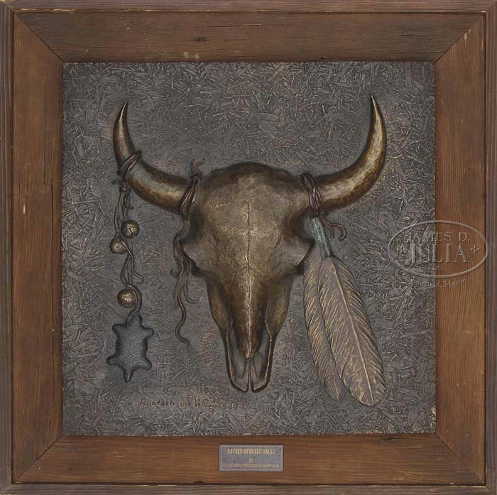 BRONZE PLAQUE TITLED “SCARED BUFFALO SKULL”. This Clarence Runtsch base relief plaque measures 17-1/2″ square mounted on a 24″ x 24″ board with plaque stating title and artist. This plaque depicts a buffalo skull with feathers, fetish and bells attached. This bronze is serial number “1/25” and copyrighted 1985 by the artist. CONDITION: Plaque overall is in very good condition with a couple of light scratches. 8-76314 JS60 (1,000-2,000)
