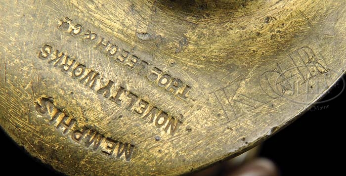 Please Note: The very tip of this sword is broken off as depicted in the image but not mentioned in the condition report. CONFEDERATE ENLISTED MAN’S CAVALRY SABER MADE BY MEMPHIS NOVELTY WORKS. You are bidding on one of the finest marked cavalry sabers you can find. This sword is in beautiful condition with a bright blade, an excellent grip, fine scabbard and the marker’s marks are extremely nice and well struck. The soldier who carried this sword inscribed his initials on top of hilt “K.G.R.” This sword’s accompanying scabbard is also in beautiful condition. Scabbard is lap seamed with lead solder and brass carrying rings. This scabbard is usually thought to be made in Columbus, Ga., however there are many examples of this scabbard on Tennessee made swords, especially Nashville Plow Works. Sword and scabbard match well for fit and patina. PROVENANCE: Bill Osborn Collection. CONDITION: Blade is gray/bright with scattered staining, pitting and cleaning. Grip is complete with most of orig dye with only minor chipping. Twisted copper wire is complete and tight. Brass hilt, pommel and ring mounts have patina, scattered scratches and dings. Scabbard body is smooth with typical rust and pitting. 4-38956 JS16 (10,000-12,000)