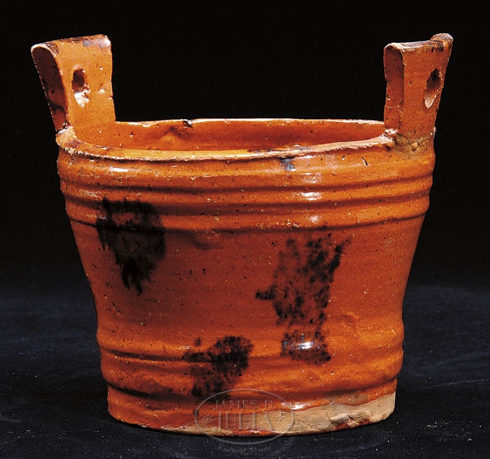 REDWARE MANGANESE-DECORATED TUB. 19th century, American. This nice example molded with simulated bands and with manganese splash decoration. The keystone-shaped handles with circular holes. SIZE: 6” overall h. x 5-3/4” dia. CONDITION: Overall high glaze with minimal imperfections. One handle re-attached. 9-99784 (300-400)