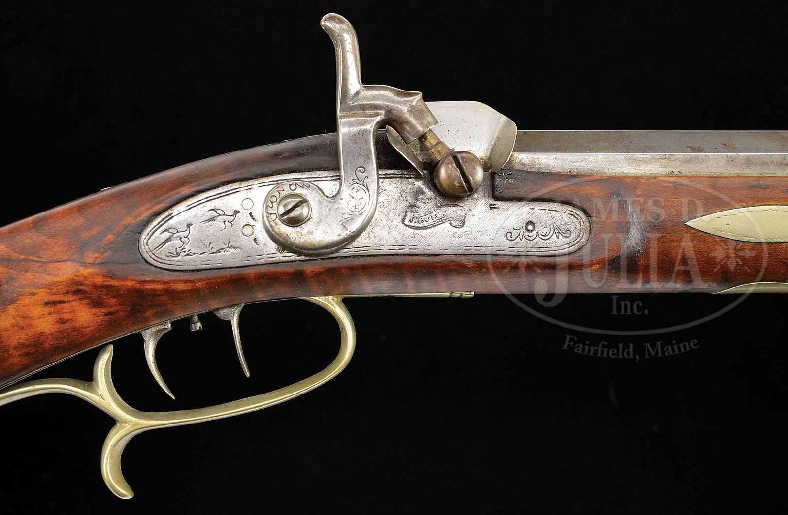 HEAVY PERCUSSION TARGET RIFLE MADE BY WEST VIRGINIA GUNSMITH M. M. BENSON. SN NSN. 45-1/2″ full oct 45 Cal. rifled bbl. marked “M. M. Benson”. Heavy bench target rifle has a blonde curly maple stock which is embellished with twenty silver inlays and a small silver cap box. Percussion lock was made by Philadelphia lock maker James Golcher. Rifle has a 6-1/2″ silver saddleplate and the ramrod is held in place by four silver ramrod pipes. Nosecap is also silver. Bbl tang stretches 6″ down the top of the wrist. There is a large 4″ engraved adjustable rear sight and a large adjustable engraved front sight. This rifle appears to have been used in the recent past as a shooter. CONDITION: Very good condition. Solid, clean and original throughout with the an old crack in the wrist area. 4-49148 RG74 (1,000-1,500)