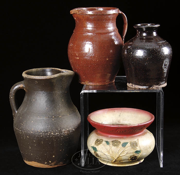 REDWARE MOLDED SPITOON, 2 PITCHERS & SMALL BULBOUS CROCK. 19th century, Virginia and Pennsylvania. Spittoon molded with floral spray within a cartouche, the everted rim molded with leaftips, probably Bell Bros., Virginia. Larger pitcher with an olive green matte glaze, incised line at shoulder, unglazed base rim and slightly pinched spout. Second pitcher in a medium brown glaze, applied with thumbprint handle. Small crock with everted rim in a dark coffee brown glaze. SIZE: Spittoon: 5″ h. 1st pitcher: 9-3/4″ h. 2nd pitcher: 8″ h. Crock: 6-1/4″ h. CONDITION: Spittoon with wear to painted surfaces and old shallow chips on base rim. Larger pitcher with spots of glazing loss overall and base rim chip, otherwise good. Smaller pitcher with shallow chip to spout area, body with U-shaped spider crack. Crock with minor losses around upper rim, otherwise very good. 9-99750 (300-500)