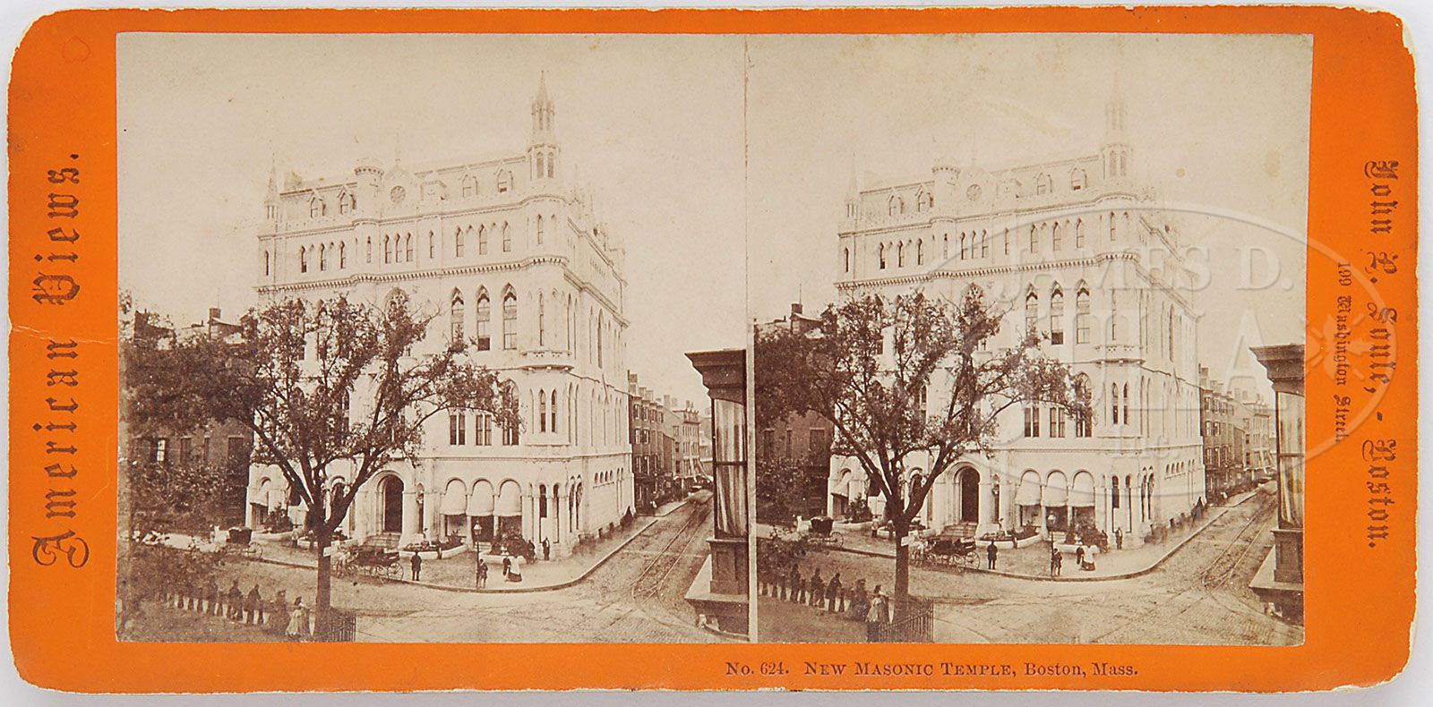 TWO MASONIC RELATED ITEMS. Last quarter 19th century, Massachusetts. Including a stereoscopic card of the New Masonic Temple circa 1875, Boston, Massachusetts published by John P. Soule, accompanied by the cover of the program of the dedication of the New Masonic Temple and a short history of the J.P. Soule business. Together with a stacked cardboard/wood carving (circa 1870’s) depicting a Masonic emblem mounted within a Victorian walnut frame, the matte of which is chip carved. SIZE: Emblem including matte: 15-1/2″ x 11-1/2″. Emblem: 5-3/4″ x 7″. PROVENANCE: Boston Estate, then Private Collection, New York City. CONDITION: Generally very good. Carving with appropriate toning from age. 9-25820 (400-600)