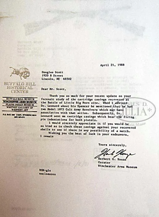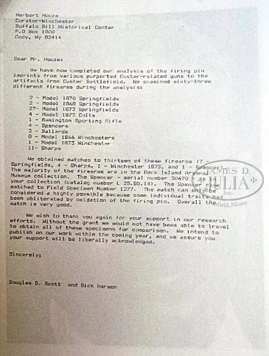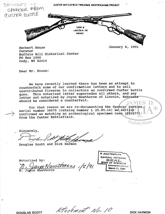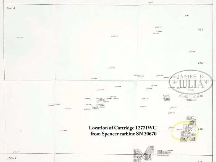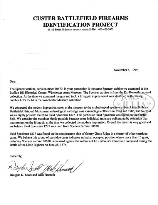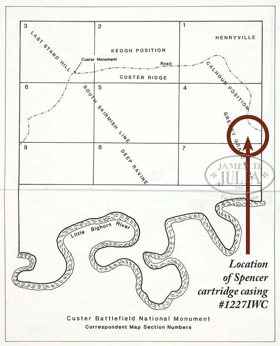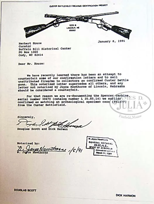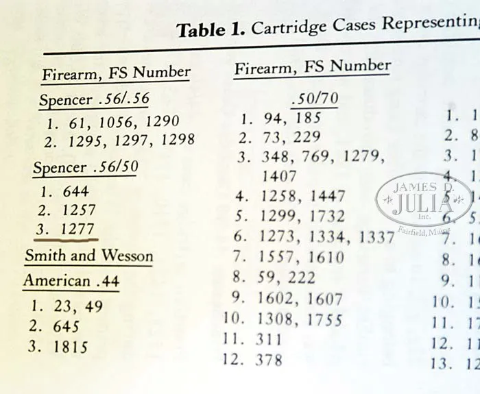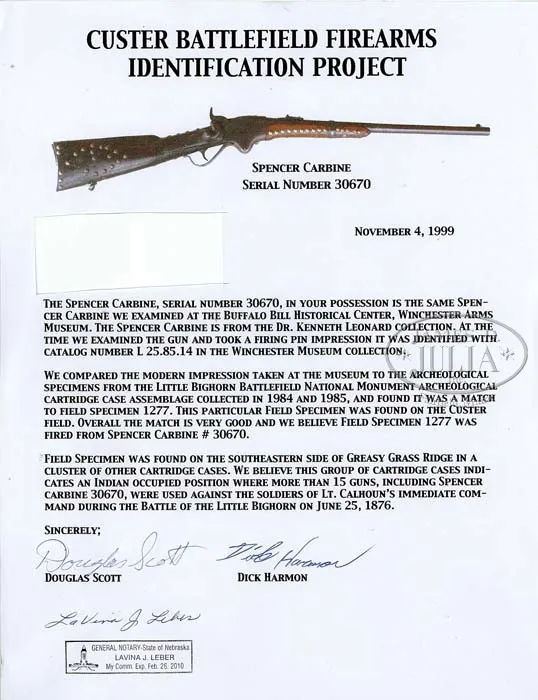 EXTREMELY RARE FORENSICALLY PROVEN INDIAN USED CUSTER BATTLEFIELD SPENCER CARBINE. SN 30670. Cal. 56-56. Standard Civil War carbine with 22″ bbl, square base front sight with German silver blade and 900 yard Spencer ladder rear sight. Left side of frame & wrist have a sling bar & ring. Mounted with uncheckered walnut that has extensive Indian brass tack decorations on both sides and top of the wrist. Forearm shows heavy saddle bow wear and the stock is heavily damaged with losses on the left side around the thin areas over the magazine tube. This carbine was part of the very famous Dr. Kenneth D. Leonard Collection of Indian Arms which was on loan to the Cody Firearms Museum, Buffalo Bill Historical Center in Cody, WY for many years. Dr. Leonard related to Mr. Glenn Swanson that he had obtained this carbine while working as a medical doctor in the Dakotas during the 1950s & 60s. In 1984 & 1985 during archeological excavations at the Little Big Horn Battlefield National Monument, after a prairie fire had exposed substantial amounts of the battlefield, numerous cartridge cases were excavated throughout the battlefield. One such specimen was number “1277” which was found on the southeastern side of Greasy Grass Ridge in a cluster of other cartridge cases which is believed to have been occupied by Indians during the battle and were used against soldiers of Lt. Calhoun’s command during the battle of the Little Big Horn on June 25, 1876. This cluster of cartridge cases disclosed that there were more than fifteen different firearms used from that particular location. A copy of the map of that location with the numbered specimens noted as to their exact place of discovery on Greasy Grass Ridge. After the excavation was closed to further exploration the Custer Battlefield Identification Project was launched to attempt to forensically match any Custer fight firearms to cartridge cases excavated from the battlefield. At that time Dr. Leonard’s collection of Indian-used firearms was on display in the Cody Firearms Museum. Internationally acclaimed forensic expert Doug Scott and members of the identification project made firing pin impressions of any and all available firearms and later, using comparison microscopes, positively identified the impressions from this carbine as being identical to those of field specimen #1277. A notarized letter to that effect accompanies this carbine. This carbine has received substantial publicity in several publications including Custer, Cavalier in Buckskin, Utley; Gunfighter, Rosa; The Plains Indian, Taylor; G.A. Custer His Life and Times, Swanson and several others. Of the fifteen firearms forensically matched to Custer Battlefield excavated cartridge cases, very few are still in private hands, with most being in museums. This is one of the few remaining chances to own a positively documented Custer Battlefield firearm and is one of the finest, authentic Indian tack decorated firearms to come to market.A casting of the original cartridge casing head will be available to the buyer of this historic item. PROVENANCE: Dr. Kenneth D. Leonard Collection; Cody Firearms Museum; Glenn Swanson Collection. CONDITION: Fair. No orig finish remains being an overall very dark brown weathered patina with areas of surface rust & light pitting. The wood shows very heavy wear with a few missing tacks and damage to the stock with a few missing slivers. However mechanics are fine, strong sharp dark bore. 4-41839 JR212 (85,000-125,000)