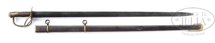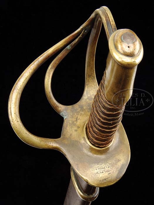 MEMPHIS NOVELTY WORKS STRAIGHT BLADED ENLISTED CAVALRY SABER. You are bidding on a scarce variant cavalry saber with massive 36″ double-edged straight blade. This sword is the 2nd largest of Confederate fighting swords. Only the straight bladed cavalry sabers made by Kraft, Goldschmidt & Kraft for Wade Hampton’s men is larger. This example, like the standard models, is marked with three lines on top of hilt “Memphis / Novelty Works / Thos Leech & Co.” PROVENANCE: Bill Osborn Collection. CONDITION: Blade is gray with scattered nicks, old sharpening, stains and pitting. The brown leather grip is almost totally intact with only wear to a few high spots, showing the typical Leech cord construction. The twisted copper wire is intact. Brass hilt, pommel and scabbard mounts are cleaned with scattered scratches and staining. Scabbard drag and throat are restored quite professionally by Mr. Osborn. 4-38951 JS17 (20,000-25,000)