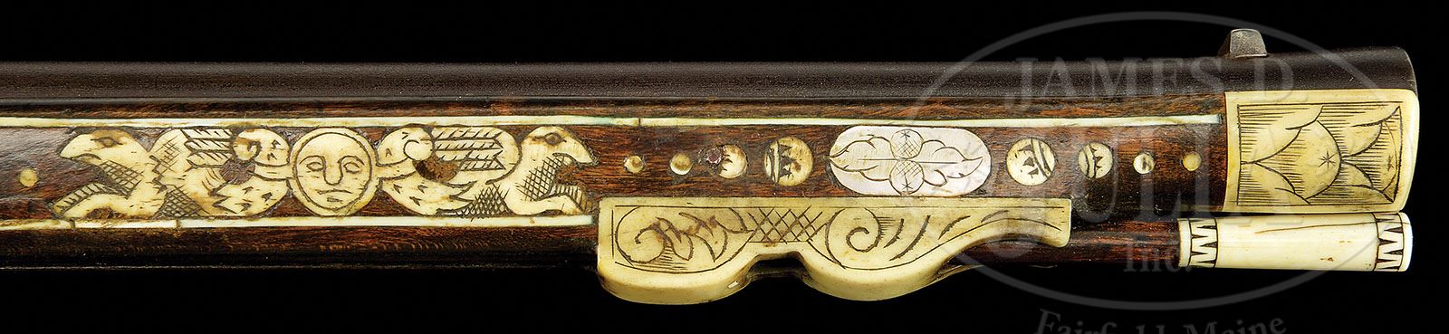 STAG HORN INLAID WHEEL LOCK TSCHINKE, 17th CENTURY AND LATER. SN NSN. Lock of characteristic form with external main spring, engraved. All small parts original. Engraved pan cover. Stock is profusely inlaid with white stag horn and mother of pearl in distinctive tschinke fashion with a fanciful tiger, eagles, dogs, monsters and a man astride a sea monster with horns across his shoulder. Gun is unusually short for a tschinke and bbl is Spanish form oct to round, also unusual. However, muzzle is swamped and stock cut out is for this bbl. PROVENANCE: Martin B. Retting, Los Angeles, CA. Collection of Dr. Douglas Sirkin. CONDITION: Lock is polished bright, somewhat worn with pitting on dog. Trigger guard and bbl have later browning. Front and rear sights appear to be of more recent vintage. Inlay is crisp with few, if any, significant replacements. Wood would rate very good to excellent. Sliding patchbox is original. Stag horn buttplate is nicely scrimshawed. Trigger is replaced. All together a very attractive and unusually short tschinke. 4-49797 MZ19 (6,000-12,000)